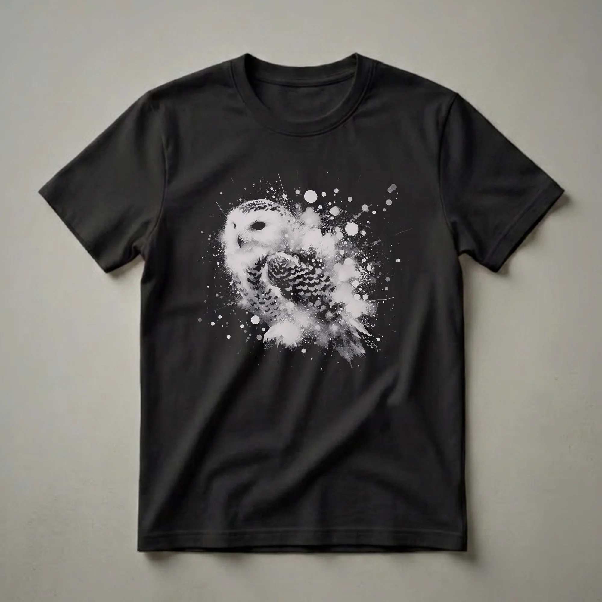 Nature lovers and wildlife enthusiasts will appreciate this striking graphic tee featuring an artistic rendering of a snowy owl. The design captures the majestic bird in a dynamic splatter paint style, with white and grey tones bursting against a stark black background. Snowy owls, known for their striking white plumage and piercing yellow eyes, are native to Arctic regions, inhabiting tundra landscapes across North America and Eurasia. They are powerful hunters, relying on their keen eyesight and silent flight to catch prey like lemmings and voles. This t-shirt is a thoughtful gift for anyone who admires these magnificent birds, whether they are birdwatchers, hikers, or simply appreciate unique wildlife art. It's a go-to tee for casual outings, nature walks, or simply relaxing at home while celebrating your passion for these incredible creatures. The artistic interpretation makes this shirt a conversation starter, well suited for expressing your connection to the natural world.