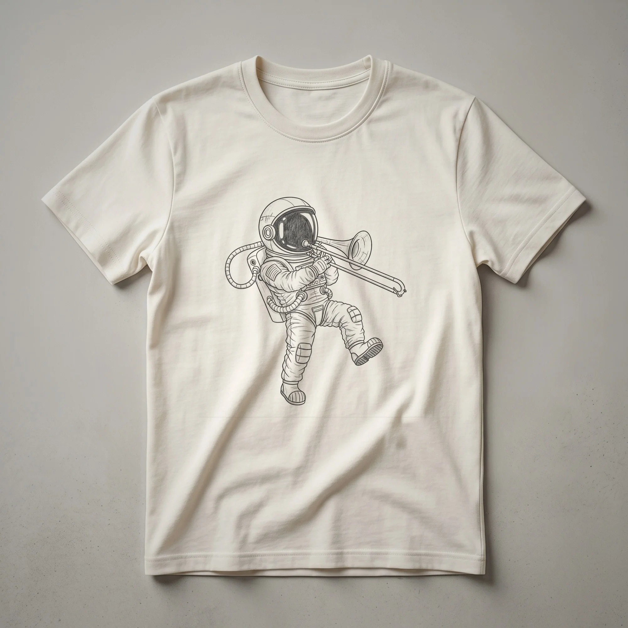 Trombone players who dream of the stars will reach for this eye-catching graphic tee. The design features a detailed line art sketch of an astronaut in full gear, complete with helmet and oxygen tank, expertly playing a trombone. The instrument, a member of the brass family, is known for its distinctive slide mechanism, allowing for a wide range of notes and expressive melodies. This shirt is a testament to the fusion of musical passion and cosmic exploration. It's a thoughtful gift for any trombonist, band member, or music student who appreciates a touch of whimsy with their craft. Imagine wearing this unique t-shirt to band practice, a casual concert, or while stargazing. The intricate sketch style brings a classic artistic feel to the modern concept of space travel, making it a conversation starter for anyone who loves music and the universe. This apparel is a staple for those who march to the beat of their own cosmic drum.