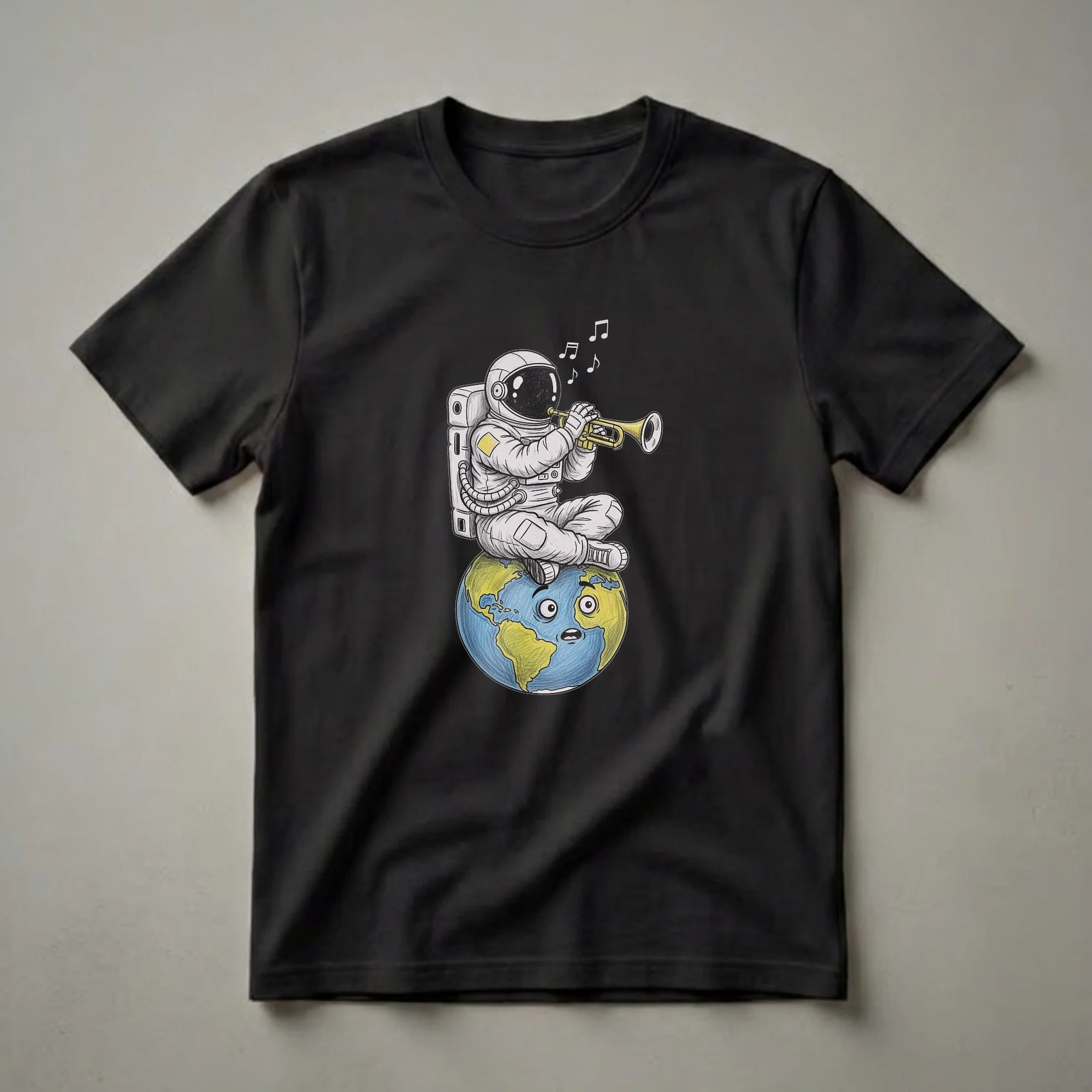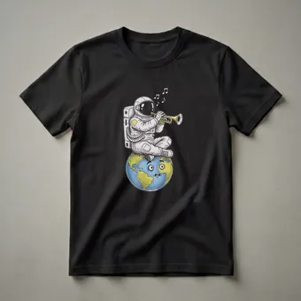 - Graphic tee featuring a humorous astronaut playing a trumpet on Earth.