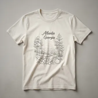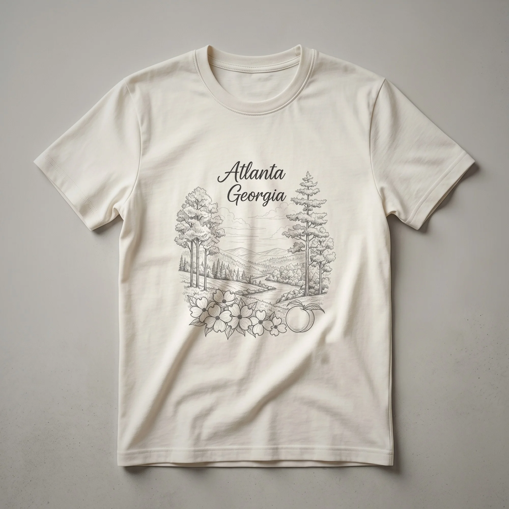 Atlanta, Georgia residents and visitors who appreciate the beauty of the Peach State will reach for this unique sketch art tee. The design captures a serene landscape, complete with rolling hills, a winding river, and lush trees that evoke the natural beauty surrounding the city. Prominently featured are delicate dogwood flowers, Georgia's state flower, and a ripe peach, symbolizing the state's nickname. This graphic shirt is a wonderful way for anyone to express their connection to Atlanta and Georgia. It makes a thoughtful gift for friends, family, or anyone who holds Atlanta dear to their heart. Wear this t-shirt to local festivals, casual outings, or while exploring the vibrant city to showcase your state pride. The detailed line art style offers a timeless appeal, making this shirt a staple for your wardrobe. It's a perfect piece of apparel for those who want to carry a piece of Georgia with them, celebrating its rich culture and natural charm. This tee is a conversation starter for anyone proud to call Georgia home or to have visited its captivating landscapes.
