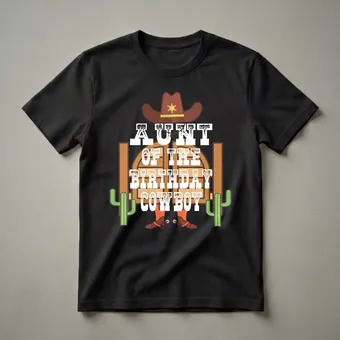 Aunties who love to celebrate their favorite young cowboys will reach for this eye-catching graphic tee. The design features a classic brown cowboy hat with a yellow sheriff's star, set against a backdrop of rustic saloon doors. Flanking the text are vibrant green cacti, evoking a true Western landscape. Below the bold lettering, a pair of orange and brown cowboy boots with spurs complete the look, ready for any rodeo-themed celebration. This shirt is a thoughtful gift for any aunt whose nephew or niece is turning into a little cowboy. Imagine her wearing this t-shirt to a birthday party, a rodeo event, or a casual family gathering, showing her pride and festive spirit. It’s a fun way for her to join in the birthday cowboy’s special day, making memories that will last. This apparel is a staple for any aunt who enjoys Western themes and family celebrations. This tee truly captures the spirit of the Wild West.