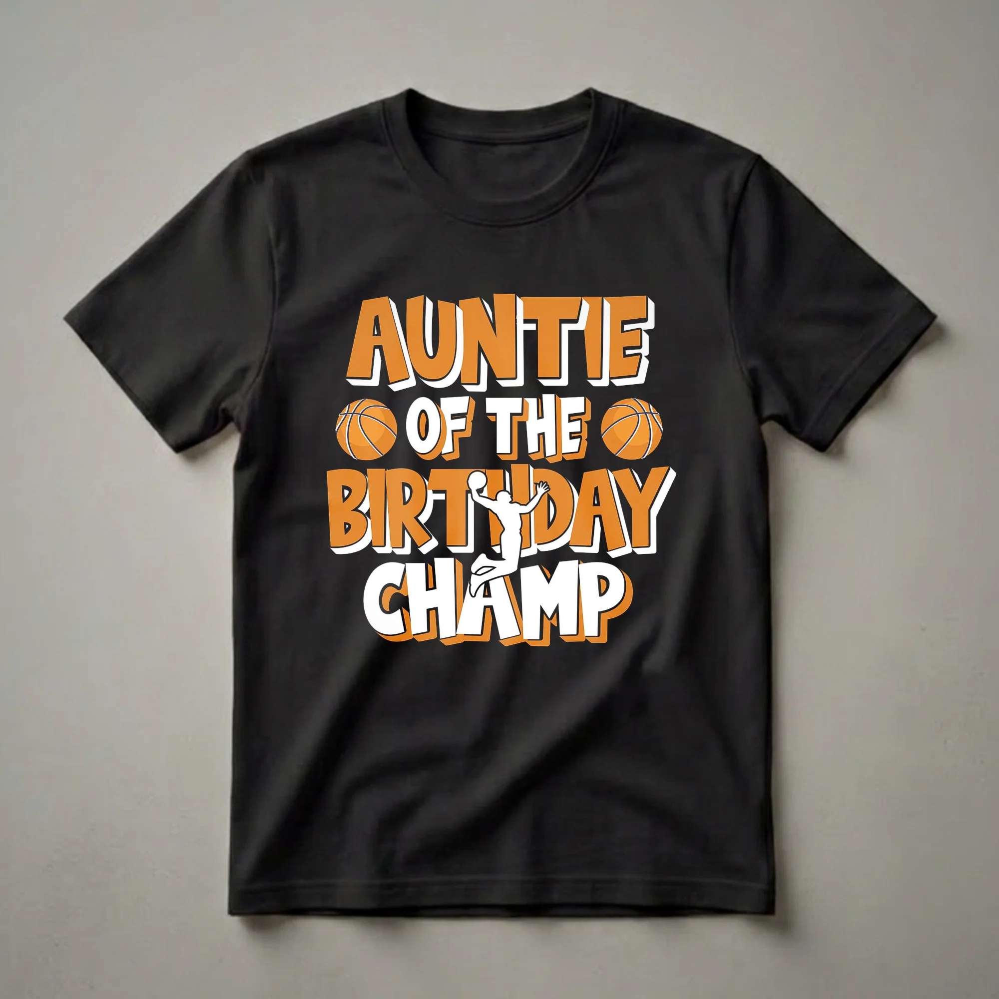 Aunties who cheer from the sidelines will love this "Auntie of the Birthday Champ" graphic tee. The design features bold, orange and white lettering with a black outline, proclaiming your proud title. Two basketballs flank the words "Auntie of the", and a dynamic silhouette of a basketball player mid-jump, ball in hand, is positioned between "Birthday" and "Champ". This shirt is a slam dunk for any aunt whose nephew is celebrating a birthday and is the star player on his team. Basketball is a sport that requires teamwork and dedication, often starting at a young age, with many young athletes developing their skills through school leagues and local clubs. This tee makes a thoughtful gift for the aunt who attends every game, cheers the loudest, and celebrates every victory. It's a great way for her to show her support and pride on game day or at the birthday party. Wear this shirt to the next basketball game or to a casual birthday gathering to showcase your special role.
