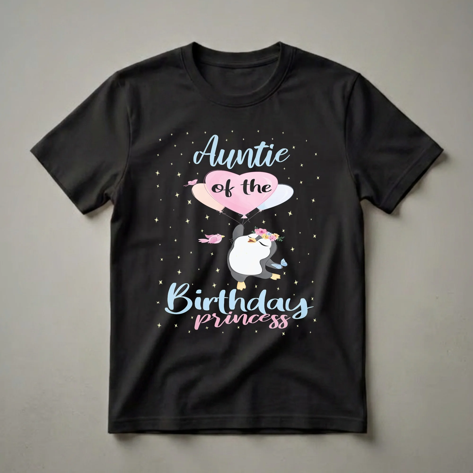 Aunties who want to show their love for the birthday girl will reach for this charming graphic tee. The design features a delightful penguin, adorned with a vibrant floral crown, joyfully suspended by pastel balloons against a dark, star-speckled background. A small pink bird flutters nearby, and a delicate blue butterfly rests on the penguin's wing, adding to the whimsical scene. The words "Auntie of the Birthday Princess" are written in playful, flowing script, with "Auntie" and "Birthday" in light blue, and "of the" and "princess" in soft pink. This t-shirt is a thoughtful gift for any aunt celebrating her niece's special day, whether it's a birthday party, a family gathering, or just a casual get-together. It's a sweet way for an aunt to express her role and her affection for the birthday princess. This comfortable shirt is great to wear to birthday brunches or any festive occasion where she wants to share in the celebration.