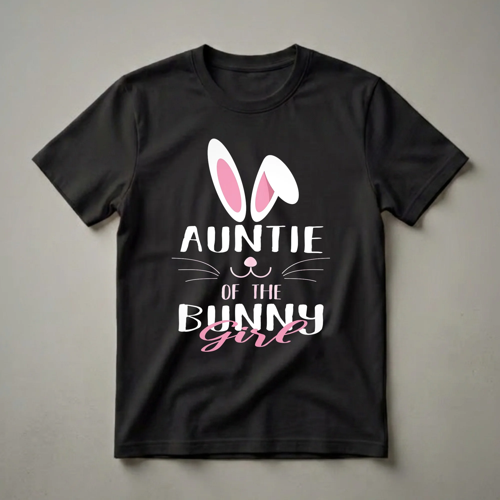 Aunties who adore their nieces will reach for this festive Easter tee. The design features a pair of white bunny ears with pink inner lining, set against a black background. Below the ears, the text reads 'AUNTIE' in bold white lettering, followed by a cute bunny face graphic with pink whiskers and a nose. The phrase 'OF THE BUNNY GIRL' is written in smaller pink script, with 'BUNNY' in white and 'GIRL' in a larger, flowing pink font. This shirt is a thoughtful gift for any aunt who loves celebrating Easter and her special 'bunny girl'. It's a fun way to show family pride during spring holidays or any time of year. Imagine wearing this cheerful t-shirt to an Easter egg hunt or a family brunch, spreading smiles and holiday spirit. This apparel is a staple for any aunt wanting to showcase her unique role in the family. The bunny motif is a classic symbol of spring and new beginnings, making this shirt particularly fitting for the season.