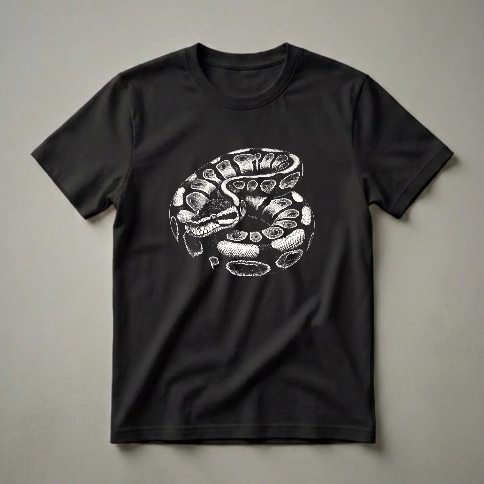 - Features a detailed black and white graphic art design of a coiled Ball Python snake.