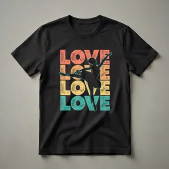 Ballet dancers who live and breathe their art will reach for this striking graphic tee. The design features a silhouette of a ballerina in a graceful pose, mid-leap with one leg extended. Behind her, the word 'LOVE' is stacked vertically, rendered in a distressed, retro font with alternating colors of coral, orange, yellow, and teal. This eye-catching t-shirt celebrates the dedication and passion required for ballet, a discipline demanding precision, strength, and artistry. It's a staple in the collection for any woman who finds joy and expression on the dance floor. This shirt makes a thoughtful gift for the ballerina in your life, whether she's a seasoned performer or just beginning her journey. Wear it to dance class, rehearsals, or casual outings to showcase your love for the art form.