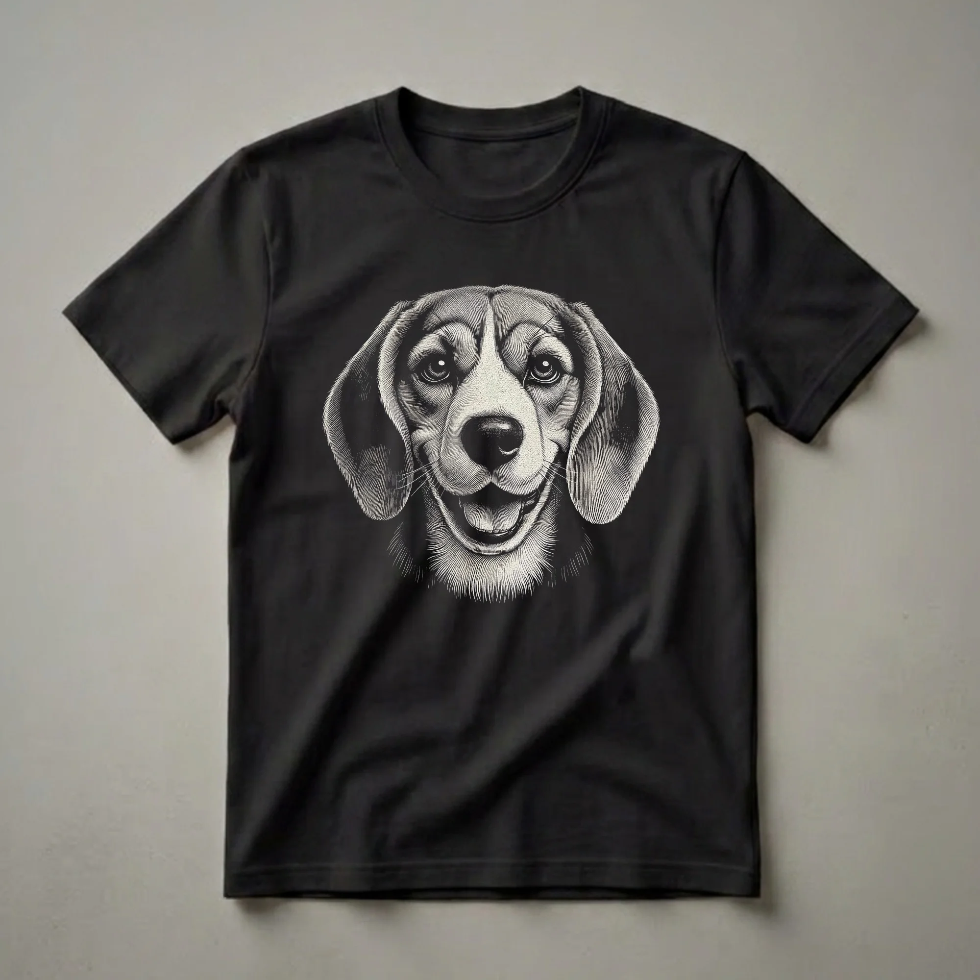Beagle owners know the breed's characteristic floppy ears and expressive eyes, perfectly captured in this detailed scratchboard art design. This graphic tee features a close-up of a Beagle's face, rendered with fine lines that give it a unique, vintage feel. The art style emphasizes the dog's friendly expression, with its mouth open in a happy pant and its bright eyes looking directly at the viewer. Beagles are known for their scent-tracking abilities and their curious, merry nature, often described as 'clowns' of the dog world. This shirt is a wonderful way for any Beagle mom or Beagle dad to express their affection for their canine companion. It makes a thoughtful gift for birthdays, holidays, or just because. Wear this unique Beagle shirt to the dog park, on walks, or to casual gatherings to spark conversations with fellow dog enthusiasts. This t-shirt is a staple for anyone who cherishes their Beagle.