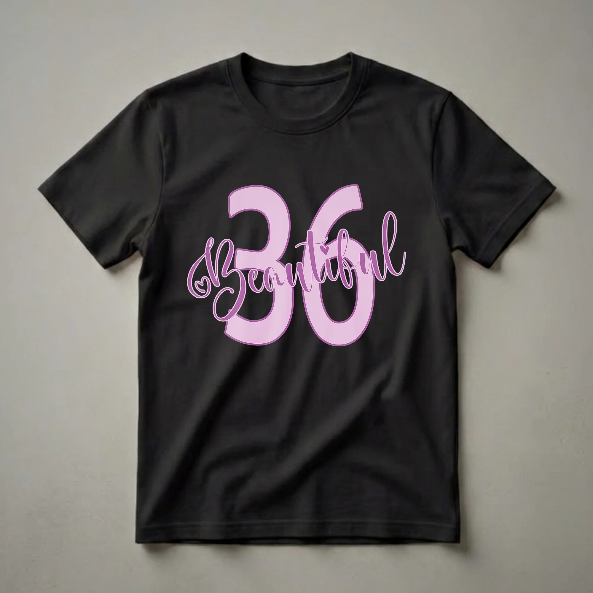 Celebrate her 36th birthday with this beautiful graphic t-shirt, featuring a stylish script overlay of 'Beautiful' across the number 36. This 'Beautiful 36' graphic tee is designed to celebrate women embracing this age with style and grace. The design features the prominent number '36' in a soft lavender hue, with the word 'Beautiful' elegantly scripted across it in a deeper purple. A small heart detail adds a touch of charm to the 'i' in 'Beautiful', making this shirt a sweet statement piece. This t-shirt is a thoughtful gift for any woman turning 36, whether it's for a birthday brunch, a casual get-together, or just to wear as a daily reminder of her radiant age. It's a staple in the collection for anyone who wants to showcase their birthday pride. Imagine her reaching for this comfortable tee on her special day, feeling celebrated and looking fabulous. This apparel is a wonderful way for her to express her joy and confidence as she enters this new chapter. It's more than just a shirt; it's a wearable affirmation of beauty and accomplishment at 36.