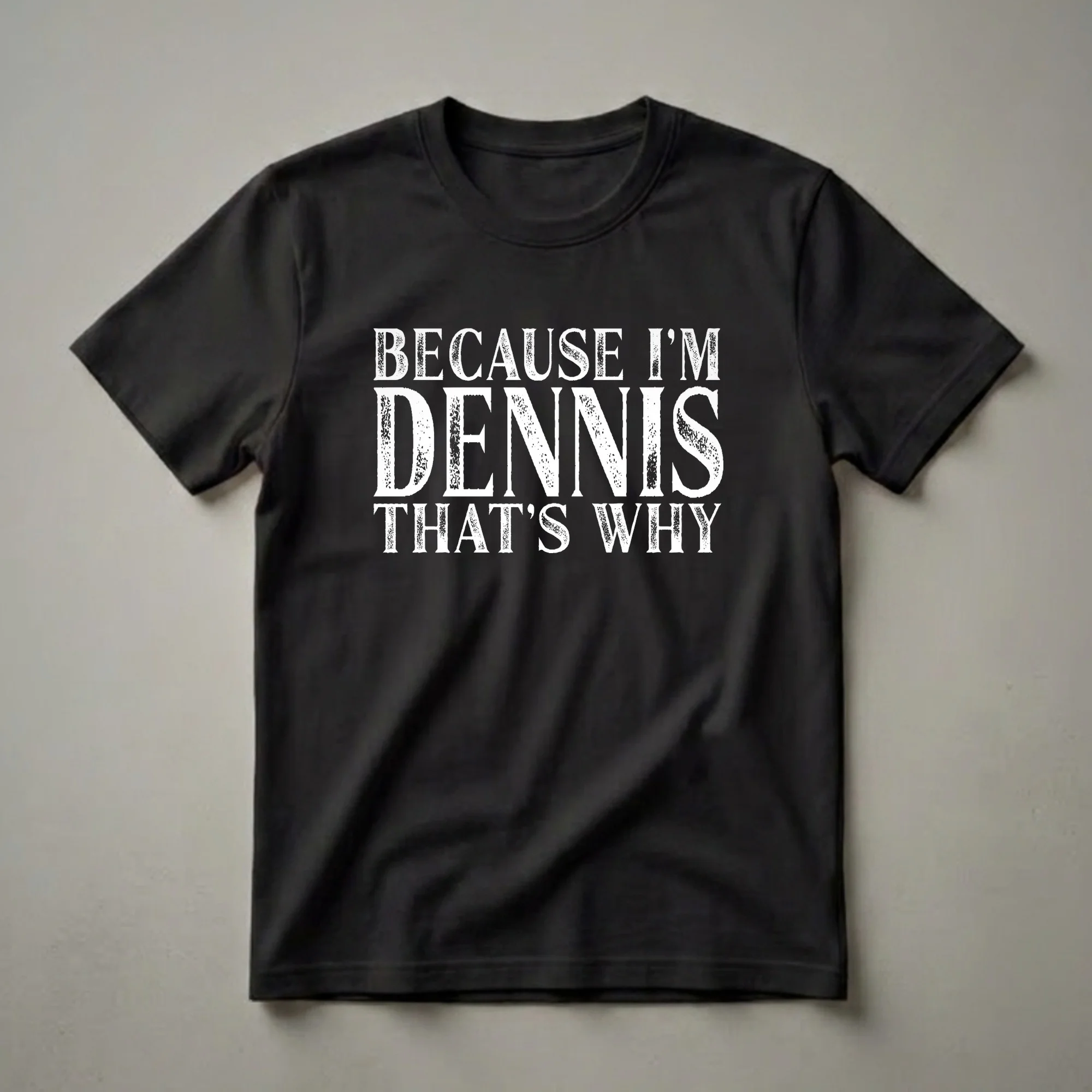 Dennis, this shirt is for you. Featuring bold, distressed white lettering that proclaims "BECAUSE I'M DENNIS THAT'S WHY," this t-shirt is a straightforward declaration of identity. The design uses a classic serif font with a textured, worn-in look, giving it a vintage appeal. This graphic tee is a staple for any Dennis who enjoys a bit of humor and wants to make a statement without saying a word. It's a conversation starter, a way to own your name and the reasons behind your actions, whatever they may be. This shirt works well for casual outings, family gatherings, or just lounging at home. It makes a thoughtful gift for any Dennis in your life, whether it's for a birthday, holiday, or just because. Celebrate your name with this unique piece of apparel that’s sure to get a smile. This t-shirt is a go-to for expressing personal identity with a playful confidence.