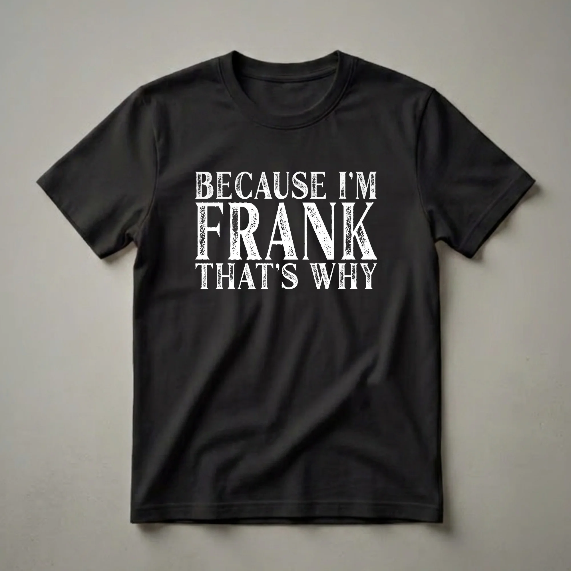 - Personalized 'Because I'm Frank That's Why' graphic tee for men named Frank.