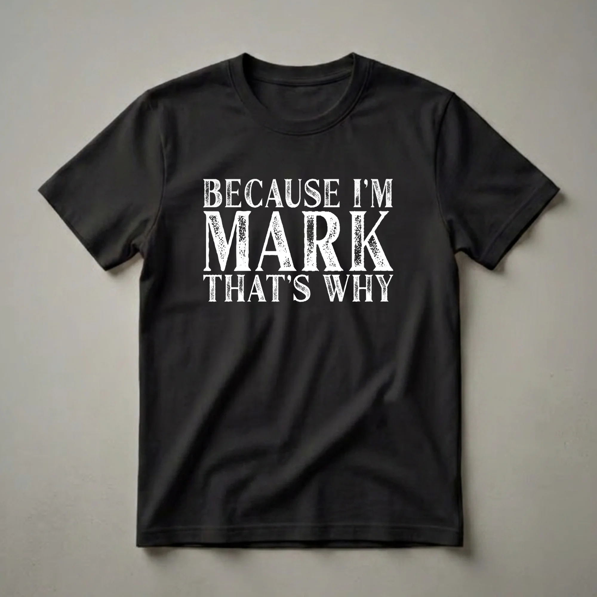 Mark, this personalized tee is for you. Featuring bold, distressed white lettering on a black background, the phrase 'BECAUSE I'M MARK THAT'S WHY' clearly states your identity with a touch of humor. This shirt is a straightforward declaration for anyone named Mark who enjoys a bit of playful self-expression. It’s a staple in any casual wardrobe, a thoughtful choice for everyday wear or for making a statement at casual gatherings. This t-shirt works well for Marks who appreciate straightforward humor and personalized items. It makes a thoughtful gift for any Mark in your life, whether it's for a birthday, holiday, or just because. Imagine Mark wearing this shirt to a family barbecue or a casual get-together with friends, sparking conversations and smiles. This graphic tee is a fun way for Mark to showcase his name and personality, offering a comfortable and stylish option for daily wear. It’s a go-to tee that celebrates individuality and the simple joy of having a name.