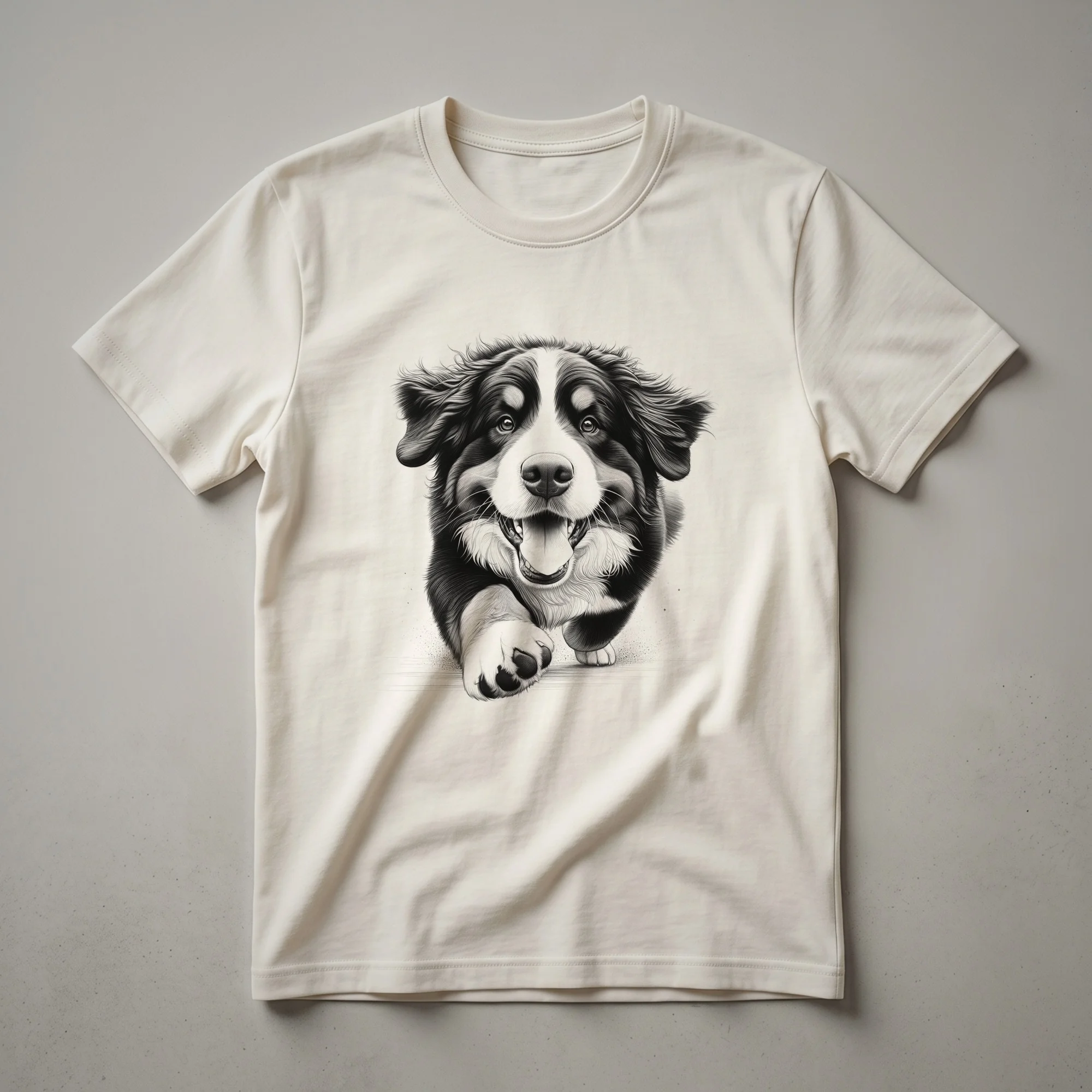 Bernese Mountain Dog owners know the joy of having these gentle giants around, and this striking graphic tee captures their energetic spirit. The design features a detailed black and white sketch of a Bernese Mountain Dog in full stride, tongue out and ears flopping, conveying a sense of pure exhilaration. This shirt is a fantastic way for any Berner mom or dad to express their affection for their furry companion. Bernese Mountain Dogs, originally from the Swiss Alps, are known for their calm demeanor and striking tri-color coats, but this artwork highlights their playful and active side. This t-shirt works well for casual outings, dog park visits, or simply lounging at home. It makes a thoughtful gift for birthdays, holidays, or any occasion for the Bernese Mountain Dog lover in your life. Wear this tee to show off your favorite breed and your passion for running, whether you're hitting the trails or just enjoying a brisk walk.