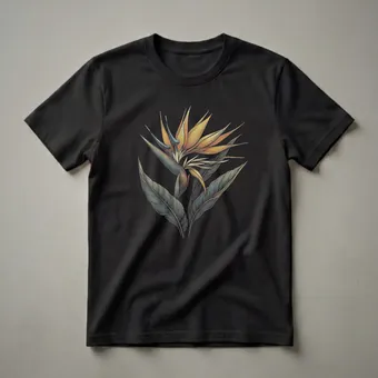 Nature lovers and admirers of exotic blooms will appreciate this striking graphic tee featuring the iconic Bird of Paradise flower. The artwork showcases the flower's vibrant yellow petals and distinctive blue accents, intricately detailed with fine lines that give it a textured, almost etched appearance. Large, deep green leaves with similar linear detailing fan out around the bloom, creating a visually captivating composition against the solid black background. This shirt is a wonderful way for women and men who are passionate about botany or simply enjoy the beauty of tropical plants to express their interests. The Bird of Paradise, scientifically known as Strelitzia reginae, is native to South Africa and is celebrated for its unique shape, often resembling a crane's head in flight. This tee works well for casual outings, garden visits, or as a thoughtful gift for the plant enthusiast in your life. It's a staple in the collection for anyone who finds joy in the natural world's most extraordinary floral displays. Wear this shirt to your next botanical garden visit or simply to brighten your day with a touch of the tropics.
