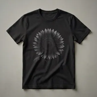 Nature lovers and fans of gothic aesthetics will appreciate this striking black sunflower graphic tee. The design features a detailed, monochromatic illustration of a sunflower, rendered in a style that evokes vintage botanical prints with a dark, moody twist. The petals are intricately shaded, showcasing a dramatic contrast against the stark black background, while the central disk is a complex pattern of seeds. A single, textured leaf and stem anchor the bloom, adding to the naturalistic yet stylized presentation. Sunflowers, scientifically known as Helianthus annuus, are renowned for their heliotropic nature, turning their faces towards the sun throughout the day. This particular rendition offers a unique interpretation, transforming the typically bright flower into an eye-catching piece of wearable art. This t-shirt works well for anyone who enjoys unique nature-inspired designs or seeks to add a touch of dark elegance to their wardrobe. It makes a thoughtful gift for friends or family members who are drawn to the beauty of the natural world with an alternative edge. Wear this tee to a casual outing, a nature walk, or simply when you want to express your appreciation for striking botanical art.
