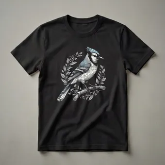 This striking graphic tee features a detailed linocut-style illustration of a vibrant Blue Jay perched on a rustic branch. The artwork is rendered in a classic black and white with subtle blue accents highlighting the bird's distinctive crest, wings, and tail feathers. Surrounding the central figure is a delicate wreath of leaves and berries, adding a touch of natural elegance to the design. Blue Jays are known for their intelligence and bold personalities, often found in eastern and central North America. They are omnivores, with a diet that includes nuts, seeds, insects, and even smaller birds' eggs. This shirt is a wonderful way for birdwatchers, ornithology enthusiasts, or anyone who appreciates the beauty of nature to express their passion. It makes a thoughtful gift for friends or family who enjoy the outdoors and the diverse avian life around them. Wear this unique t-shirt to your next birdwatching excursion, a nature walk, or simply as a conversation starter on casual outings. This comfortable tee is a staple for any nature lover's wardrobe.