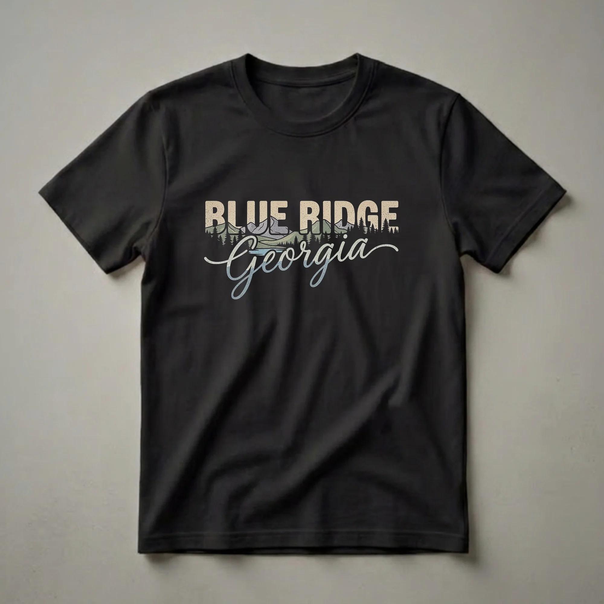 Blue Ridge, Georgia, is a picturesque mountain town nestled in the Chattahoochee-Oconee National Forest, known for its stunning natural beauty and outdoor recreation. This graphic tee captures that essence with a retro-inspired design. The text "BLUE RIDGE" is presented in bold, distressed block letters, overlaid with a stylized mountain range and pine trees. Below, the word "Georgia" is written in a flowing, script font, with a subtle watercolor effect depicting a serene lake or river. The color palette evokes a vintage feel, with muted greens, blues, and earthy tones. This shirt is a thoughtful gift for anyone who has visited or dreams of visiting the North Georgia mountains, hikers, nature lovers, or those who appreciate vintage travel aesthetics. It's a comfortable and stylish way to wear your appreciation for this beautiful region. This t-shirt works well for casual outings, exploring the outdoors, or simply relaxing at home while reminiscing about your favorite Georgia getaway. It's a staple for any wardrobe celebrating the charm of the Blue Ridge Mountains.