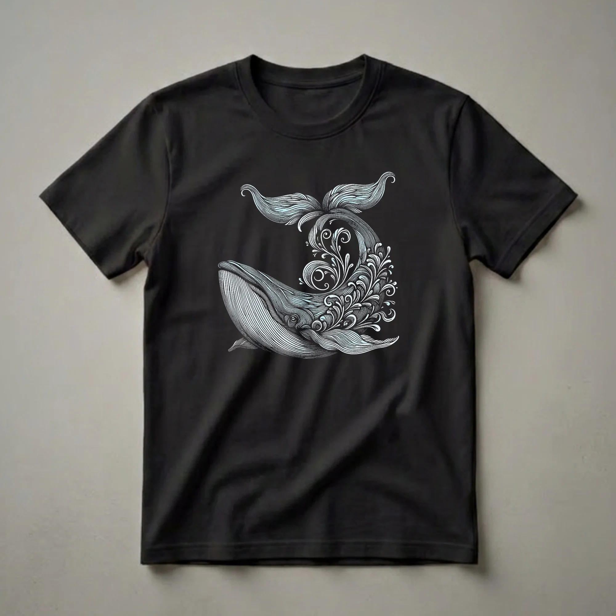 Ocean conservationists and marine biology fans who spend their weekends at aquariums will reach for this striking blue whale graphic tee. The artwork depicts a majestic blue whale in fine white and soft-blue linework, its body dissolving into elaborate scrolling floral and wave motifs that spiral outward against the black background. The design captures both the immense scale and quiet grace of the animal in a single flowing composition. Blue whales (Balaenoptera musculus) are the largest animals ever known to have lived on Earth, reaching lengths up to 100 feet and weights exceeding 200 tons. Despite their enormous size, they are filter feeders, consuming up to four tons of krill daily during feeding season in polar waters. They migrate thousands of miles each year between cold feeding grounds and warm tropical breeding areas. This shirt makes a thoughtful gift for marine biologists, oceanographers, whale-watching enthusiasts, or the ocean lover in your life who advocates for sea conservation. Wear this eye-catching tee to the aquarium, a beach cleanup event, or a casual weekend outing to spark conversations about these gentle giants. Any ocean-minded person will appreciate the artistry and depth of meaning behind this design.
