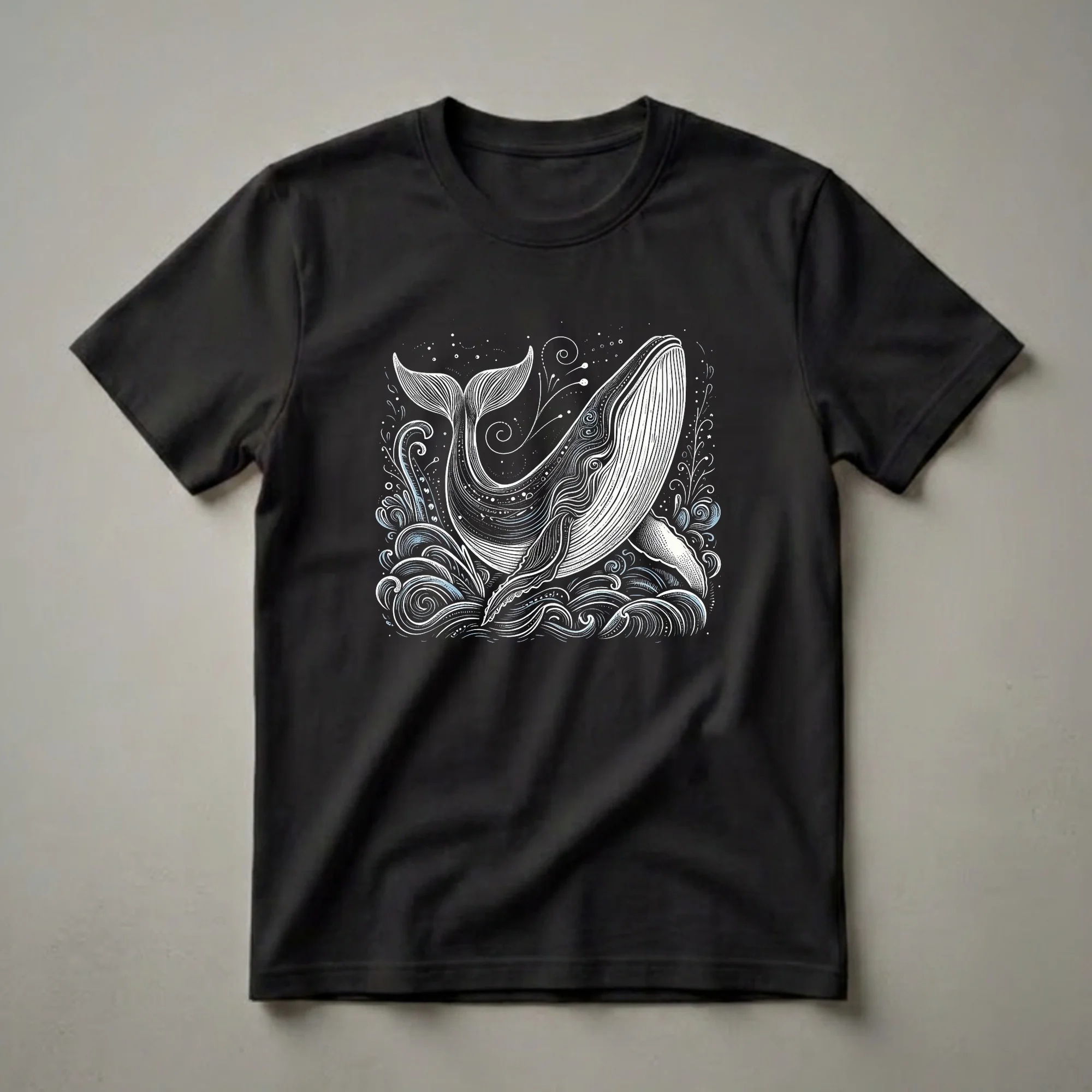Ocean lovers who appreciate the majesty of marine life will reach for this artistic blue whale t-shirt. The striking design features a stylized blue whale breaching through swirling waves, rendered in intricate white linework against a deep black background. Decorative elements like dots, stars, and elegant swirls add a touch of whimsy to the underwater scene. Blue whales, the largest animals on Earth, are filter feeders that inhabit all the world's oceans, migrating between feeding and breeding grounds. This graphic tee captures the awe-inspiring presence of these gentle giants. It makes a thoughtful gift for anyone fascinated by the ocean's wonders, from divers and marine biologists to those who simply admire the vastness of the sea. Wear this shirt to your next beach outing, a casual day out, or while attending an ocean conservation event to spark conversations about marine conservation. This unique t-shirt is a staple for any ocean enthusiast's wardrobe, offering a blend of artistic flair and a deep connection to the marine world.
