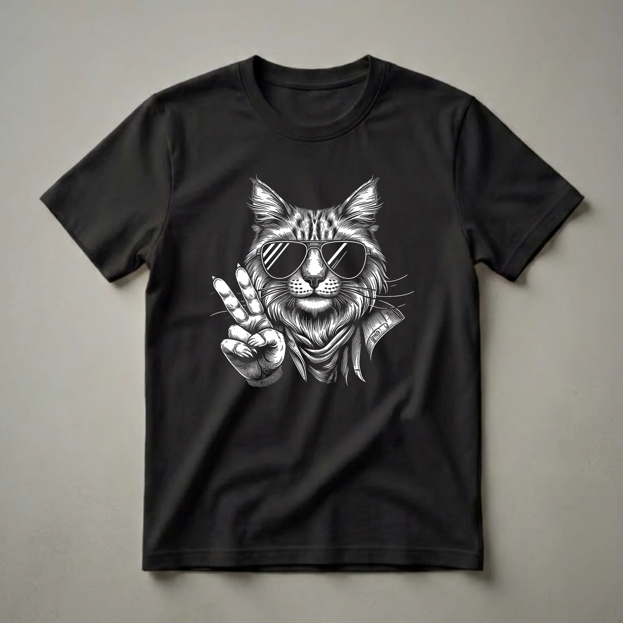 Bobcat owners and wildlife enthusiasts will appreciate this striking graphic tee. The design features a detailed linocut-style illustration of a bobcat, complete with its characteristic tufted ears and short tail, sporting cool aviator sunglasses. This wild cat is striking a peace sign with its paw, adding a touch of playful rebellion to the artwork. Bobcats, known for their elusive nature and adaptability, thrive in diverse habitats across North America, from forests and swamps to deserts. This shirt is a thoughtful gift for anyone who admires these solitary predators or enjoys unique, artistic apparel. Wear this t-shirt to casual outings, nature walks, or to express your appreciation for the wild. It's a go-to tee for those who want to stand out with a touch of feline cool.
