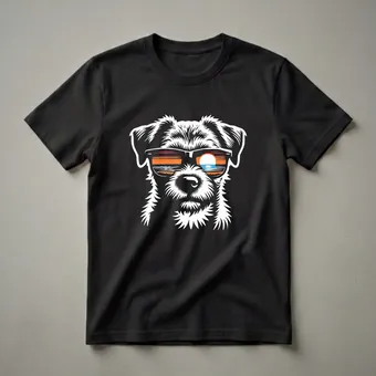 Border Terrier owners who appreciate a touch of cool will reach for this eye-catching graphic tee. The design features a striking white illustration of a Border Terrier, a breed known for its tenacious spirit and friendly demeanor, sporting a pair of sunglasses. These aren't just any sunglasses; they reflect a vibrant sunset scene over the ocean, complete with a glowing sun, colorful sky, and calm water. This imagery evokes a sense of relaxation and vacation vibes, a thoughtful choice for anyone who dreams of beach getaways with their furry companion. The Border Terrier, originating from the border region between England and Scotland, is a hardy and spirited dog, making this shirt a great way to celebrate their unique personality. This t-shirt works well for casual outings, dog park visits, or simply lounging at home. It makes a thoughtful gift for the Border Terrier mom or dad in your life who loves to showcase their canine pride. Wear this shirt to your next dog-friendly event or on a sunny day out, and let your dog's cool style shine through.