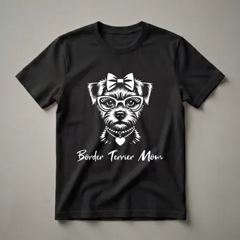 Border Terrier moms know the unique charm and spirited personality of their beloved companions. This eye-catching graphic tee celebrates that special bond, featuring a stylized Border Terrier adorned with a chic bow, fashionable glasses, and a delicate pearl necklace with a heart pendant. The design is rendered in a striking white against a dark background, making the intricate details of the dog's expressive face and accessories pop. Border Terriers, originating from the rugged border country between England and Scotland, are known for their tenacity, intelligence, and affectionate nature, making them wonderful family pets. This t-shirt is a fantastic way for any woman who cherishes her Border Terrier to showcase her pride. It makes a thoughtful gift for birthdays, holidays, or just because for the dog mom in your life. Wear this comfortable tee to your next dog park visit, a casual outing with friends, or while relaxing at home with your furry best friend. It's a staple in the collection for any devoted Border Terrier owner.