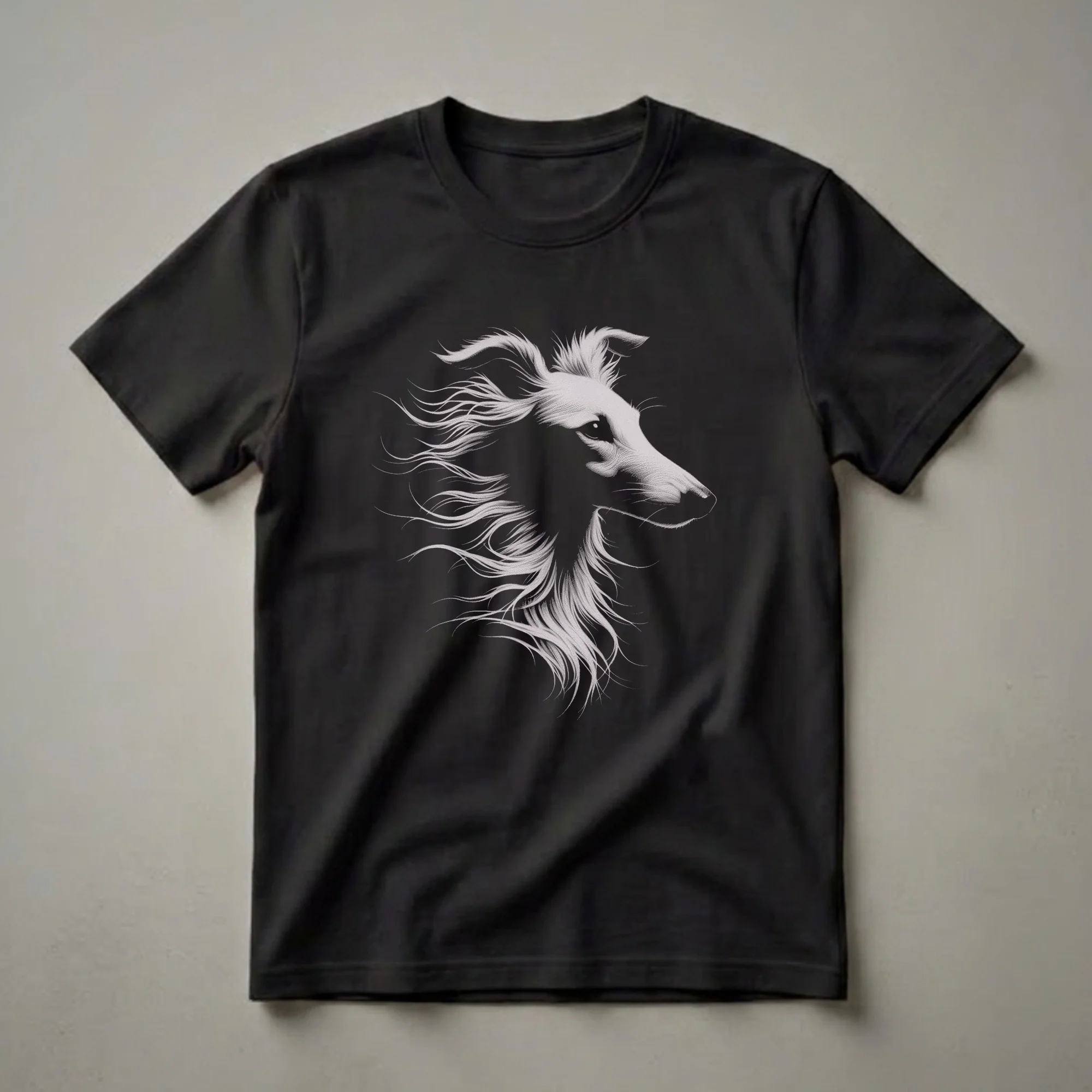 Borzoi enthusiasts who appreciate the breed's elegant profile and flowing lines will reach for this striking graphic tee. The artwork features a detailed, monochromatic drawing of a Borzoi's head in profile, with its characteristic long muzzle and abundant, wind-swept fur rendered in a fine, stippled style against a solid black background. This artistic representation captures the breed's noble and graceful demeanor, reminiscent of classic wildlife illustrations. Borzoi, also known as the Russian Wolfhound, were originally bred in Russia for coursing wolves and other game, a testament to their speed and agility. This t-shirt works well for anyone who admires these sighthounds, whether they are owners, breeders, or simply admirers of their unique beauty. It makes a thoughtful gift for a dog mom or a dedicated Borzoi owner who cherishes their canine companion. Wear this unique shirt to dog shows, casual outings, or while relaxing at home, celebrating your passion for this magnificent breed. The detailed artistry makes this shirt a conversation starter among fellow dog lovers.
