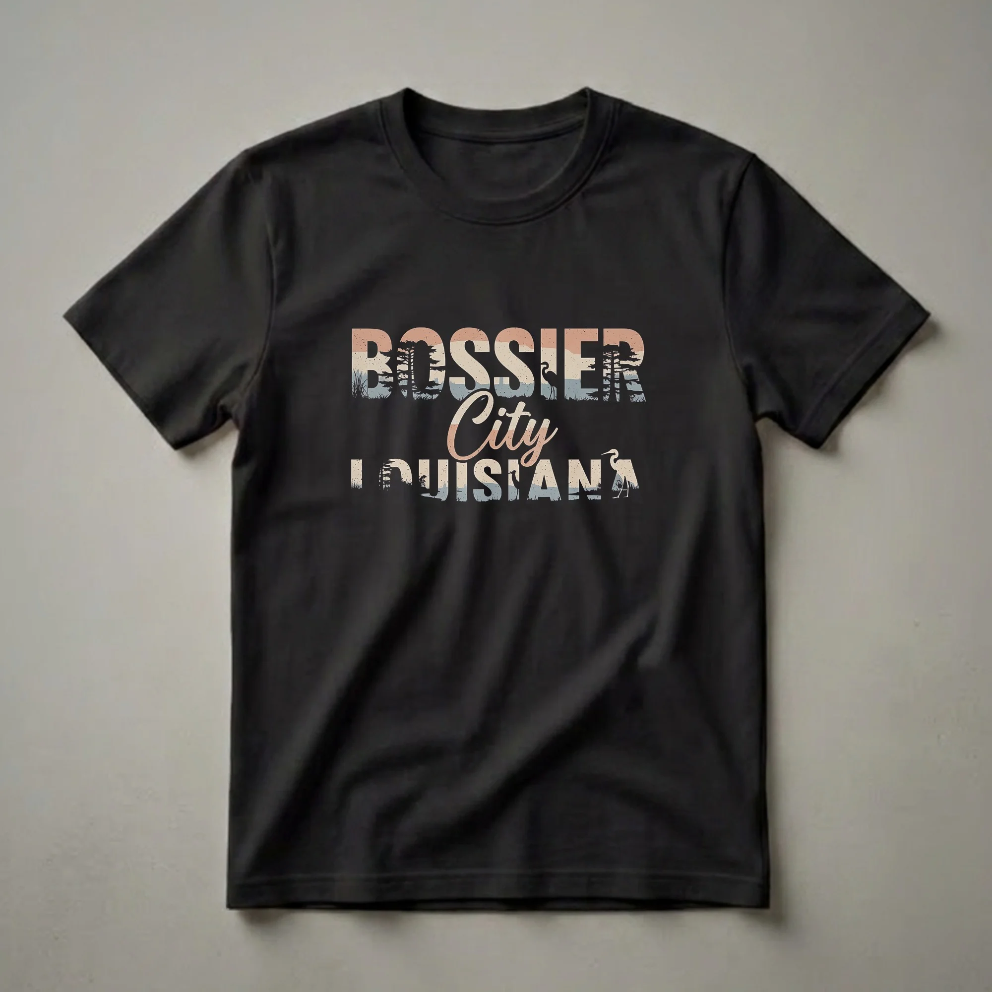 Bossier City, Louisiana residents and fans can now wear their pride with this distinctive retro-inspired graphic t-shirt. The design features the words "Bossier City" in a stylized font above "LOUISIANA" in bold, block letters. Within the letters, a vintage landscape unfolds, showcasing silhouetted pine trees, tall grasses, and serene water scenes. Graceful herons, common in Louisiana's wetlands, are also depicted, adding a touch of local wildlife to the artwork. This tee captures the essence of the region, evoking images of the bayous and natural beauty found throughout the state. Louisiana is known for its unique culture, vibrant music scene, and delicious cuisine, and this shirt serves as a wearable tribute to Bossier City's place within that rich tapestry. It's a thoughtful gift for anyone who calls Bossier City home, has roots there, or simply cherishes memories of the area. This shirt works well for casual outings, family gatherings, or simply relaxing at home while reminiscing about the Pelican State. Embrace your Louisiana spirit with this eye-catching piece of apparel.