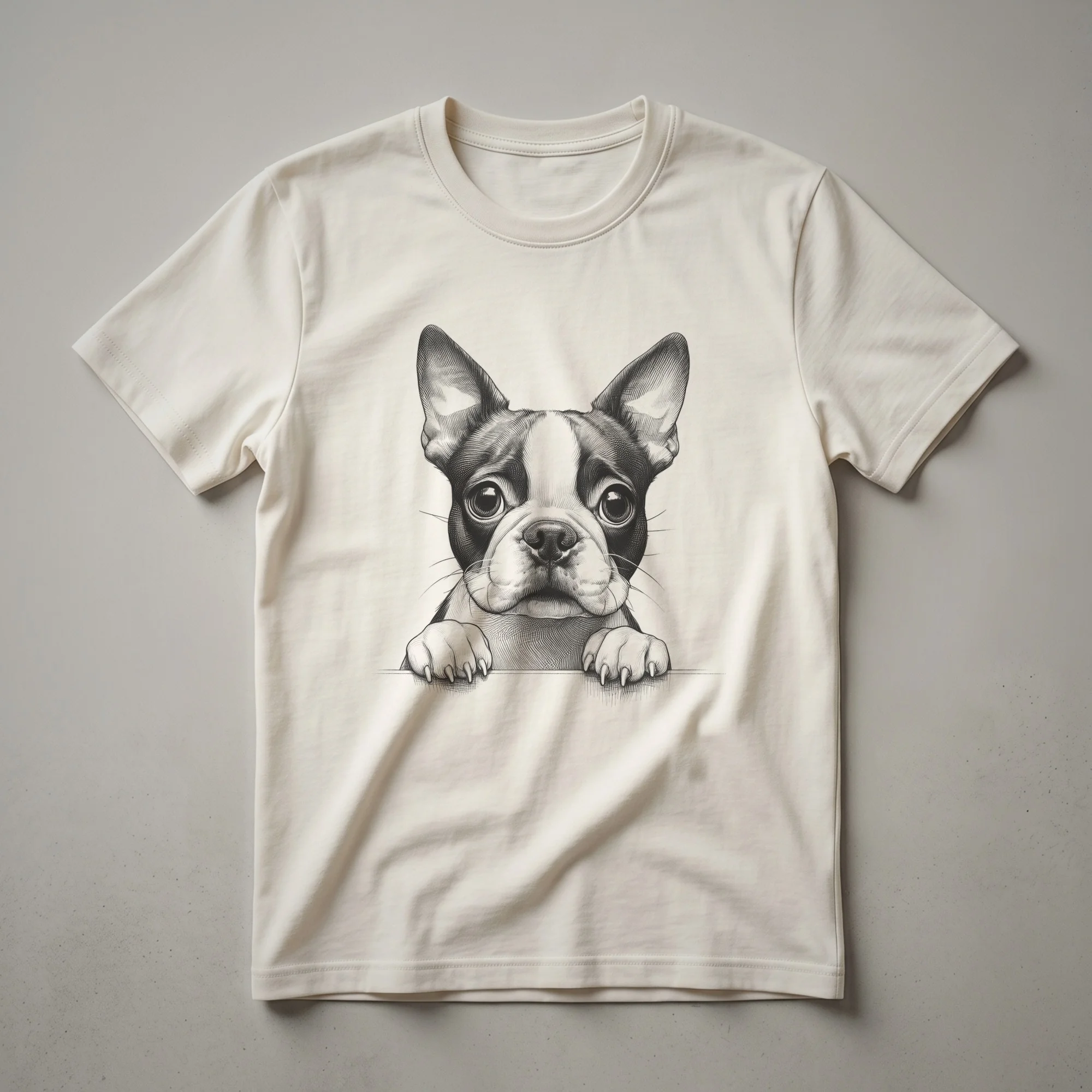 Boston Terrier moms and dads who want to showcase their affection for their beloved companions will reach for this eye-catching graphic tee. The design features the distinct, alert face of a Boston Terrier peeking from the bottom edge of the shirt, its expressive eyes and characteristic ears instantly recognizable. Boston Terriers, known for their playful yet dignified demeanor and compact build, originated in the United States and are often called the 'American Gentleman' due to their tuxedo-like markings. This t-shirt is a wonderful way for any Boston Terrier owner to express their connection to their furry friend. It makes a thoughtful gift for birthdays, holidays, or just because for the Boston Terrier enthusiast in your life. Wear this comfortable shirt to casual outings, dog park visits, or while relaxing at home with your canine companion.