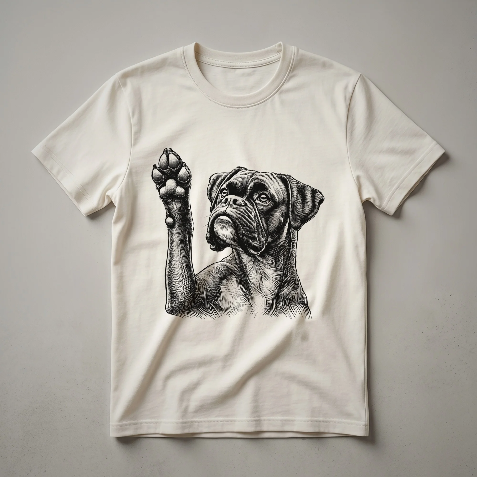 Showcase your devotion to the charming Boxer breed with this minimalist graphic tee featuring a playful paw-raising dog. This graphic tee captures that essence with a striking minimalist design of a Boxer raising its paw. The clean lines and simple silhouette make this shirt a versatile addition to any dog lover's wardrobe. Boxers, known for their energetic nature and affectionate personalities, are a beloved breed worldwide. This t-shirt is a subtle yet clear way to express your admiration for these loyal companions. It's a thoughtful gift for the Boxer mom or dad who cherishes their furry friend, or for anyone who appreciates unique dog-themed apparel. Wear this shirt to your next dog park visit, a casual outing with friends, or simply while relaxing at home with your canine companion. It's a go-to tee that celebrates the joy dogs bring into our lives. The design is eye-catching without being overly busy, making it a staple for everyday wear. This shirt is a fantastic way to connect with fellow dog enthusiasts and spark conversations about your favorite breed. It's more than just a piece of clothing; it's a statement of your passion for Boxers.