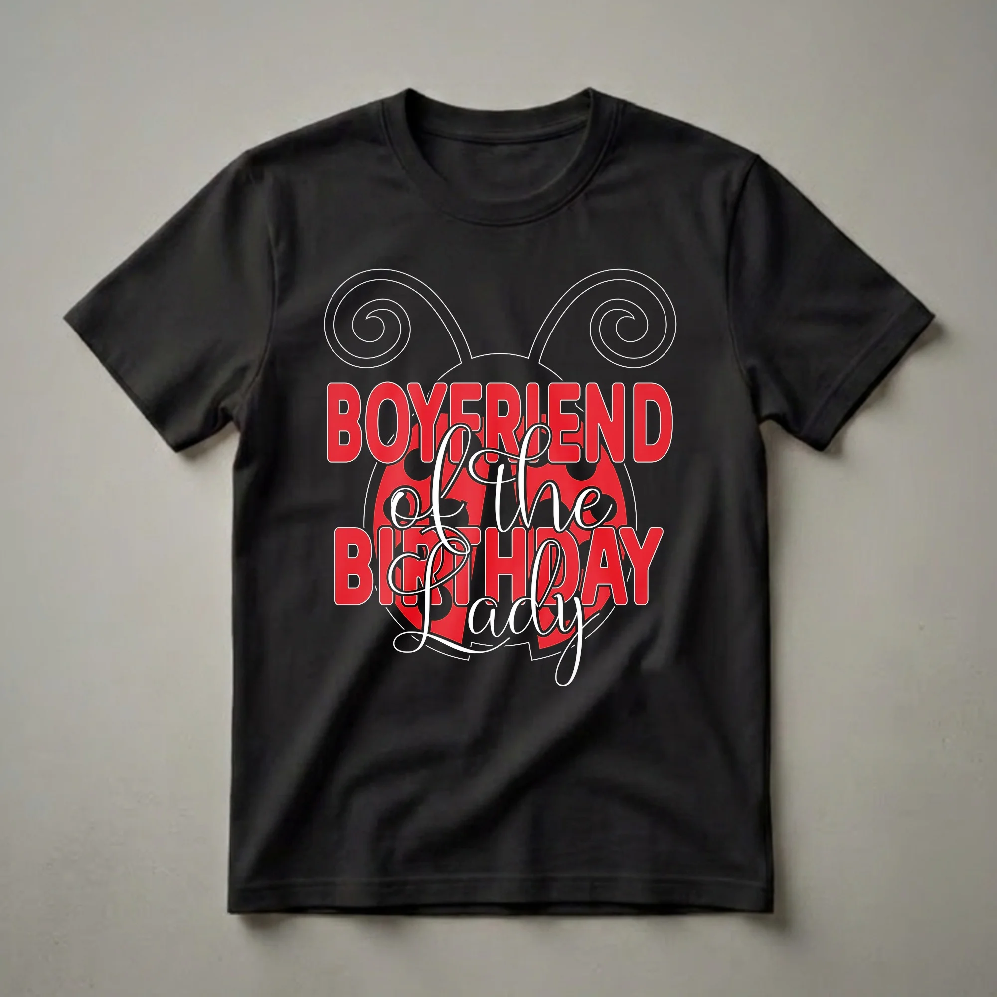- Proudly sport this 'Boyfriend of the Birthday Lady' tee featuring a vibrant ladybug graphic.