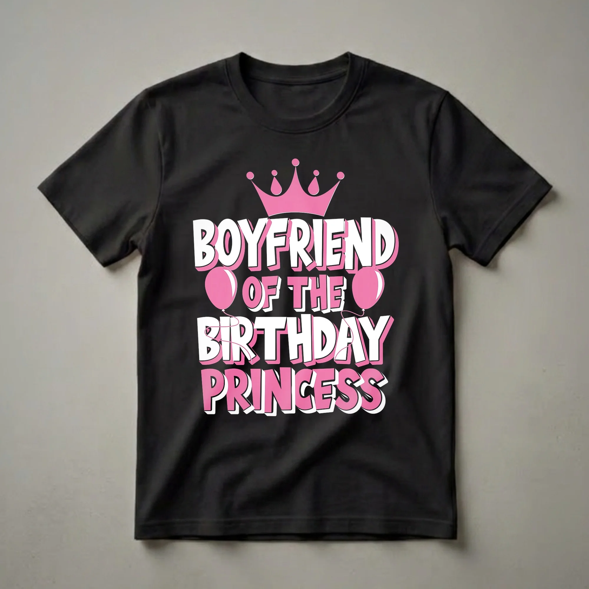 Boyfriends of birthday princesses know how to show their support and celebrate in style. This eye-catching graphic tee proudly declares "Boyfriend Of The Birthday PRINCESS" in bold, playful lettering. A vibrant pink crown sits atop the text, symbolizing the birthday girl's royal status, while two pink balloons add a festive touch. This shirt is a fun way for him to join in the birthday festivities and show he's part of the celebration squad. It's a staple in the collection for any boyfriend wanting to match his princess on her big day. This t-shirt works well for attending birthday parties, family gatherings, or any event celebrating the birthday girl. It makes a thoughtful gift for the boyfriend who wants to stand out and show his affection. He will reach for this tee year after year to celebrate his special someone. Wear it to the birthday dinner or the party for a coordinated look.