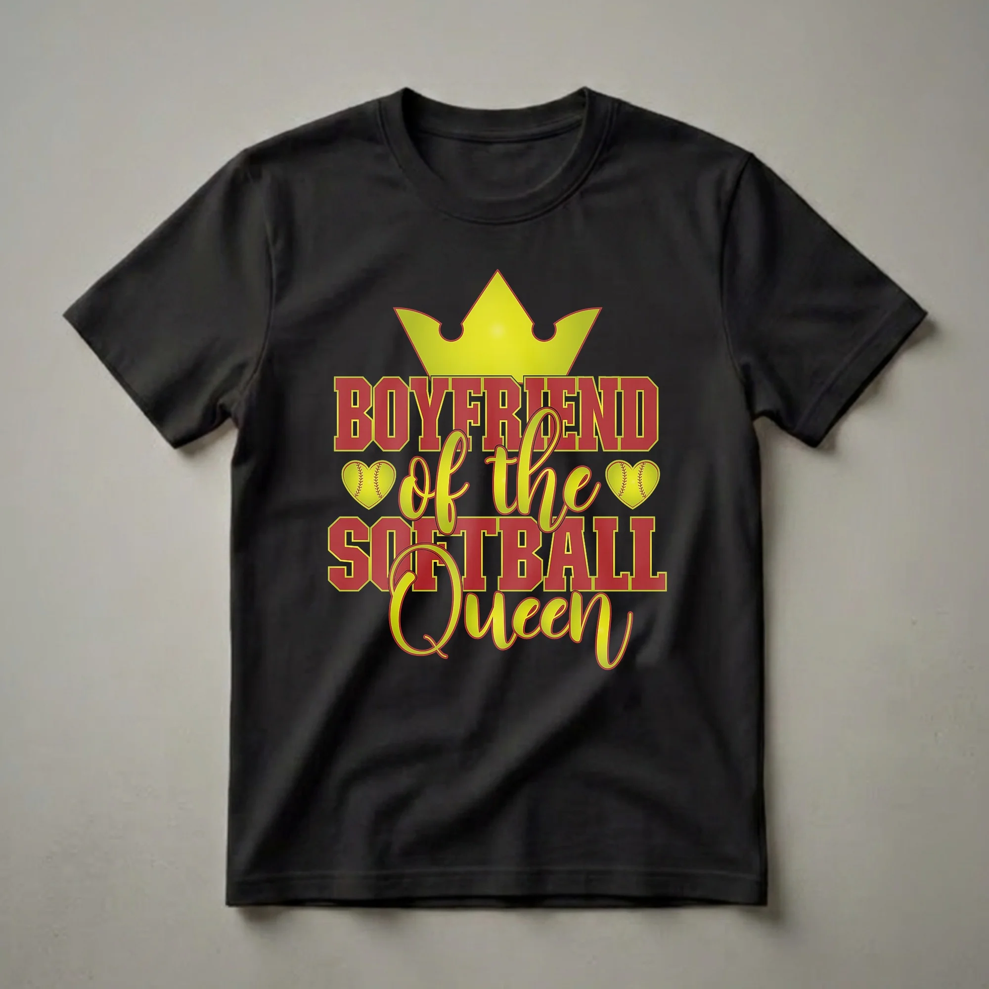 This striking graphic t-shirt proudly declares 'Boyfriend of the Softball Queen' in bold, collegiate-style lettering. A vibrant yellow crown sits atop the text, symbolizing royalty, while two yellow softball hearts, complete with stitching detail, flank the phrase 'of the'. The design is set against a black background, making the red and yellow text pop. This shirt is a fantastic way for any boyfriend to show his pride and support for his girlfriend who excels on the softball field. Softball is a sport that requires agility, teamwork, and a strong arm, often played by women and girls at various levels from youth leagues to college. This tee is a thoughtful gift for a boyfriend whose partner is a star player, perhaps for an upcoming birthday or just to celebrate her achievements. He can wear this shirt to games, team events, or casual outings to let everyone know he's cheering for the queen of the diamond. It's a staple in the collection for any proud boyfriend of a softball athlete.