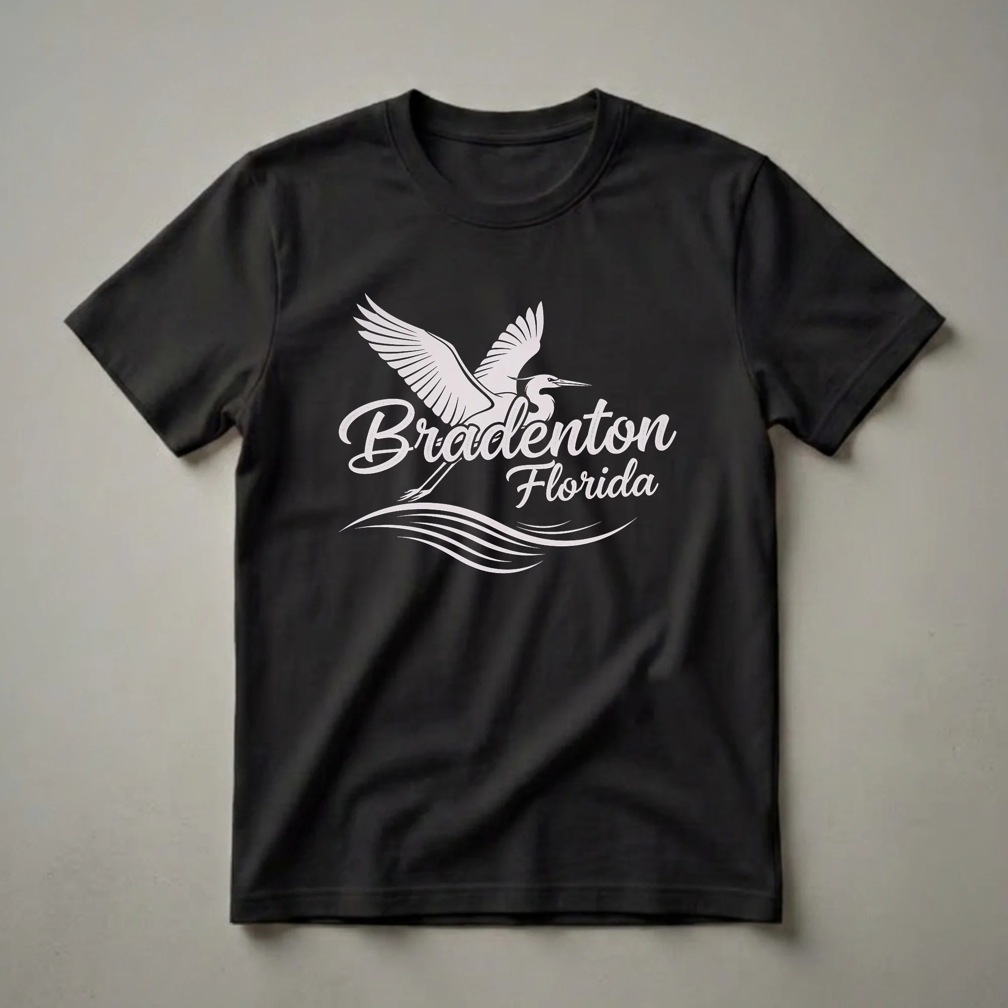 Florida travelers and residents who appreciate the coastal charm of the Sunshine State will reach for this distinctive t-shirt. The design prominently features a graceful egret in flight, a common sight along Florida's many waterways and coastlines, soaring above stylized waves that evoke the state's beautiful beaches and abundant marine life. Bradenton, situated on the Gulf Coast of Florida, is known for its vibrant arts scene and proximity to stunning natural landscapes like Anna Maria Island and the Manatee River. This graphic tee captures that essence, making it a thoughtful gift for anyone who has visited or calls Bradenton home. Wear this shirt to brunch, a casual outing, or while exploring the local attractions to showcase your Florida pride. It's a staple for any wardrobe celebrating the unique spirit of this coastal city. This apparel serves as a wearable reminder of sunny days and ocean breezes.