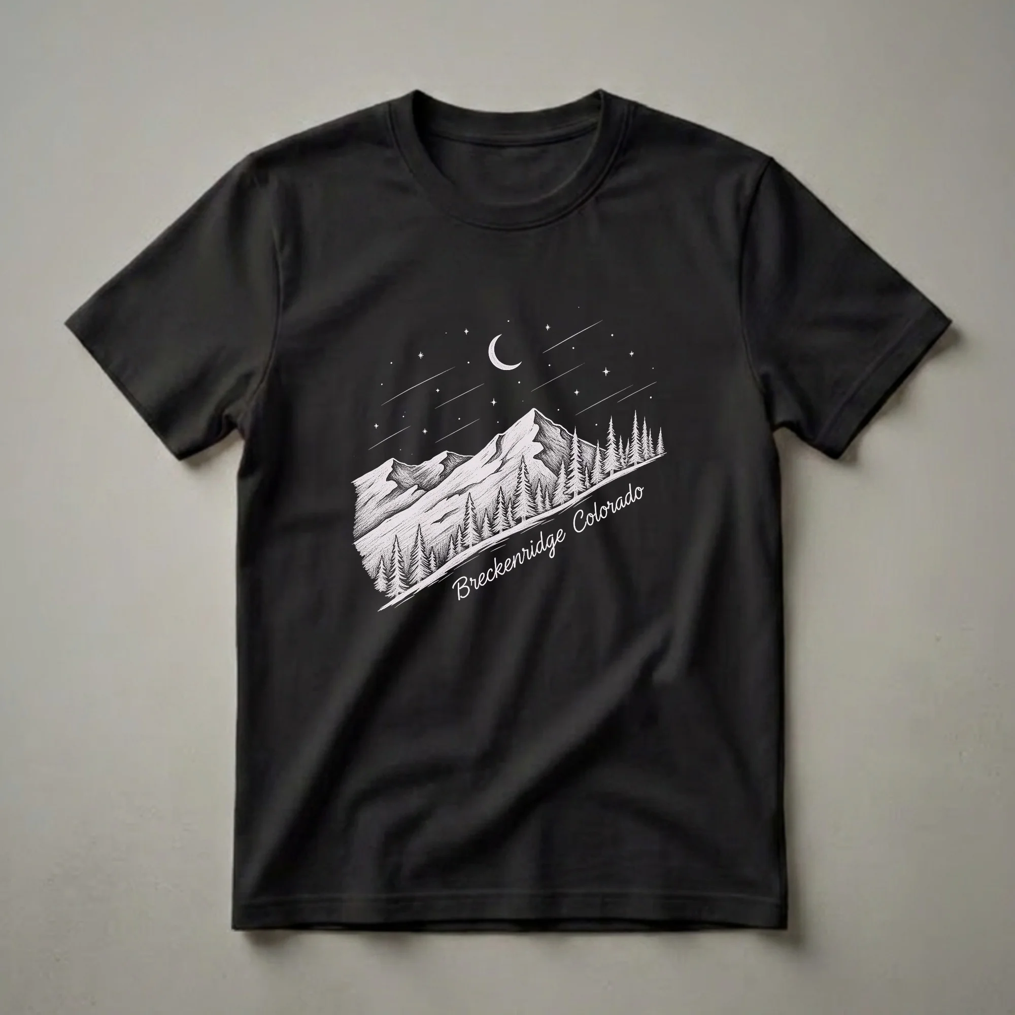 Breckenridge sits at 9,600 feet in Summit County, Colorado, making it one of the highest incorporated towns in the United States. The Breckenridge Ski Resort covers 2,908 acres across five mountain peaks and receives an average of 300 inches of snowfall per year, among the highest totals in Colorado. The town itself dates to 1859 as a gold mining camp and retains its Victorian historic district along Main Street. This vintage scratchboard graphic tee captures Breckenridge in its most serene form, a rocky alpine peak rising above pine and fir trees, a crescent moon hanging in a star-scattered sky, all in fine white line art. It is the kind of image that skiers recognize as the mountain at the end of a long clear day. Wear this shirt après-ski, on a Summit County winter weekend, or any day the high country is calling. A thoughtful gift for Breckenridge regulars, Colorado ski locals, and anyone who has watched the stars appear above 10,000 feet.