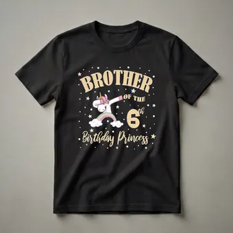 Six-year-old boys who are the proud brother of a birthday princess will love this eye-catching graphic tee. The design features a whimsical dabbing unicorn perched on a pastel rainbow, surrounded by stars and confetti against a black background. Bold, cream-colored text announces "BROTHER OF THE 6th BIRTHDAY PRINCESS," clearly stating his special role in the celebration. This t-shirt is a fantastic way for him to show his support and excitement for his sister's milestone birthday. It's a thoughtful gift idea for any young boy whose sister is turning six and embracing a magical unicorn theme for her party. Imagine him wearing this shirt to the birthday party, family gatherings, or just for everyday fun, feeling like a part of the royal celebration. This unique shirt makes a memorable keepsake for the birthday boy, commemorating a special day in his life and his bond with his sister. It's more than just apparel; it's a statement of sibling pride and birthday cheer, making him feel like a co-star in his sister's magical day.