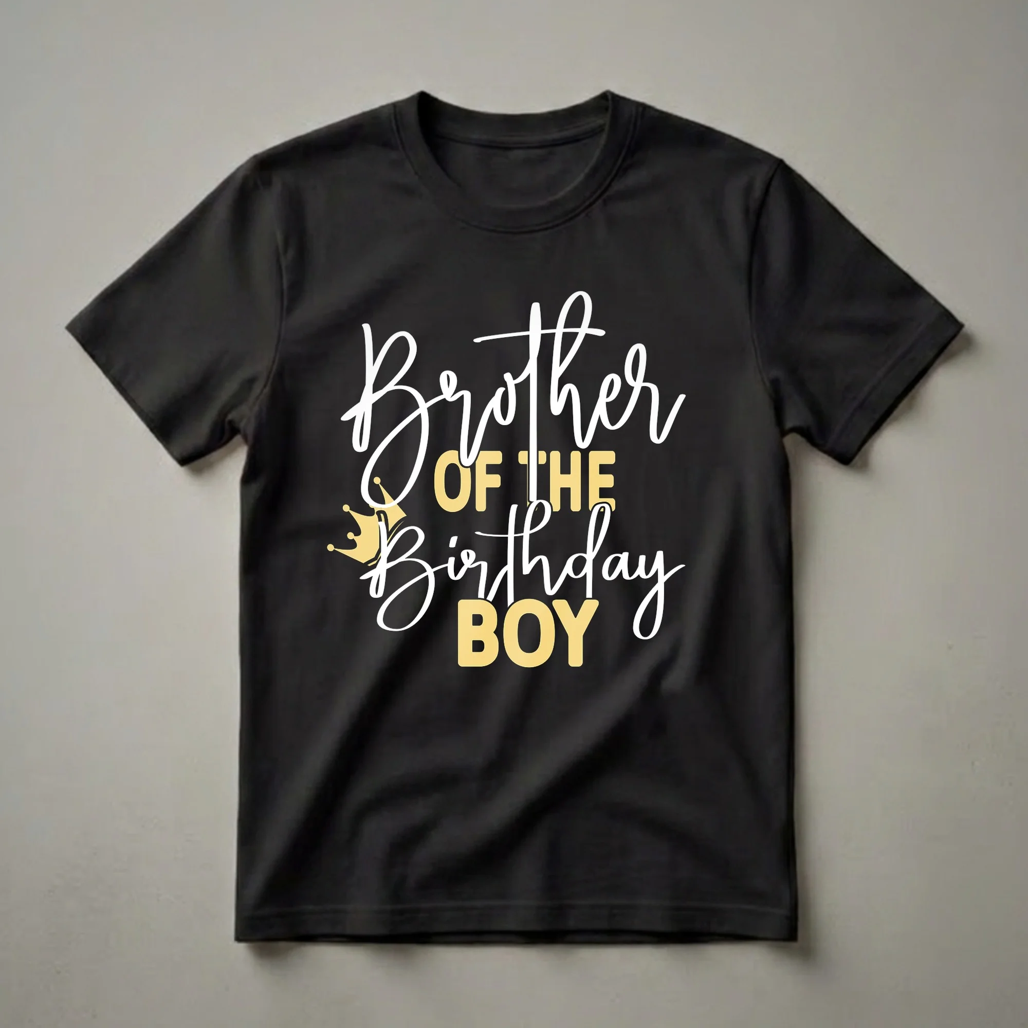 Siblings of the birthday boy will love this eye-catching graphic tee, featuring bold text that proudly declares their role in the celebration. The design showcases the phrase "Brother OF THE Birthday BOY" in a stylish mix of white script and gold block lettering. A golden crown with small dots sits to the left of the text, adding a regal touch to the birthday theme. This shirt is a fantastic way for brothers to show their support and excitement for the guest of honor's special day. It's a staple in any birthday sibling's wardrobe, great to wear to the party, family gatherings, or for creating memorable photos. This tee makes a thoughtful gift for any brother who wants to stand out and be recognized during his sibling's birthday festivities. It's a fun and festive addition to any birthday outfit, ensuring the brother of the birthday boy feels included and celebrated. Brothers often share a unique bond, and this shirt highlights that connection during a special milestone.