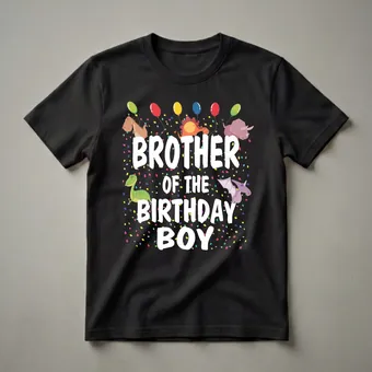 Young boys who are the brother of the birthday boy will love this festive dinosaur-themed t-shirt. The graphic features bold white text that reads "BROTHER OF THE BIRTHDAY BOY," surrounded by a playful assortment of cartoon dinosaurs, colorful balloons, and confetti against a black background. Dinosaurs like a Tyrannosaurus Rex, Stegosaurus, Triceratops, Brachiosaurus, and a Pterodactyl are depicted in a fun, cartoonish style, making this tee an eye-catching addition to any birthday celebration. This shirt is a thoughtful gift for a younger sibling who wants to show support for his brother's special day. It's great to wear to a birthday party, family gathering, or any casual event where he wants to showcase his dinosaur fascination. The vibrant design ensures he'll stand out and feel like part of the celebration. This t-shirt is a great way for the brother of the birthday boy to join in the fun and excitement of the party, making his own role in the celebration clear and exciting. It's a staple for any young dinosaur fan's wardrobe, especially during birthday season.