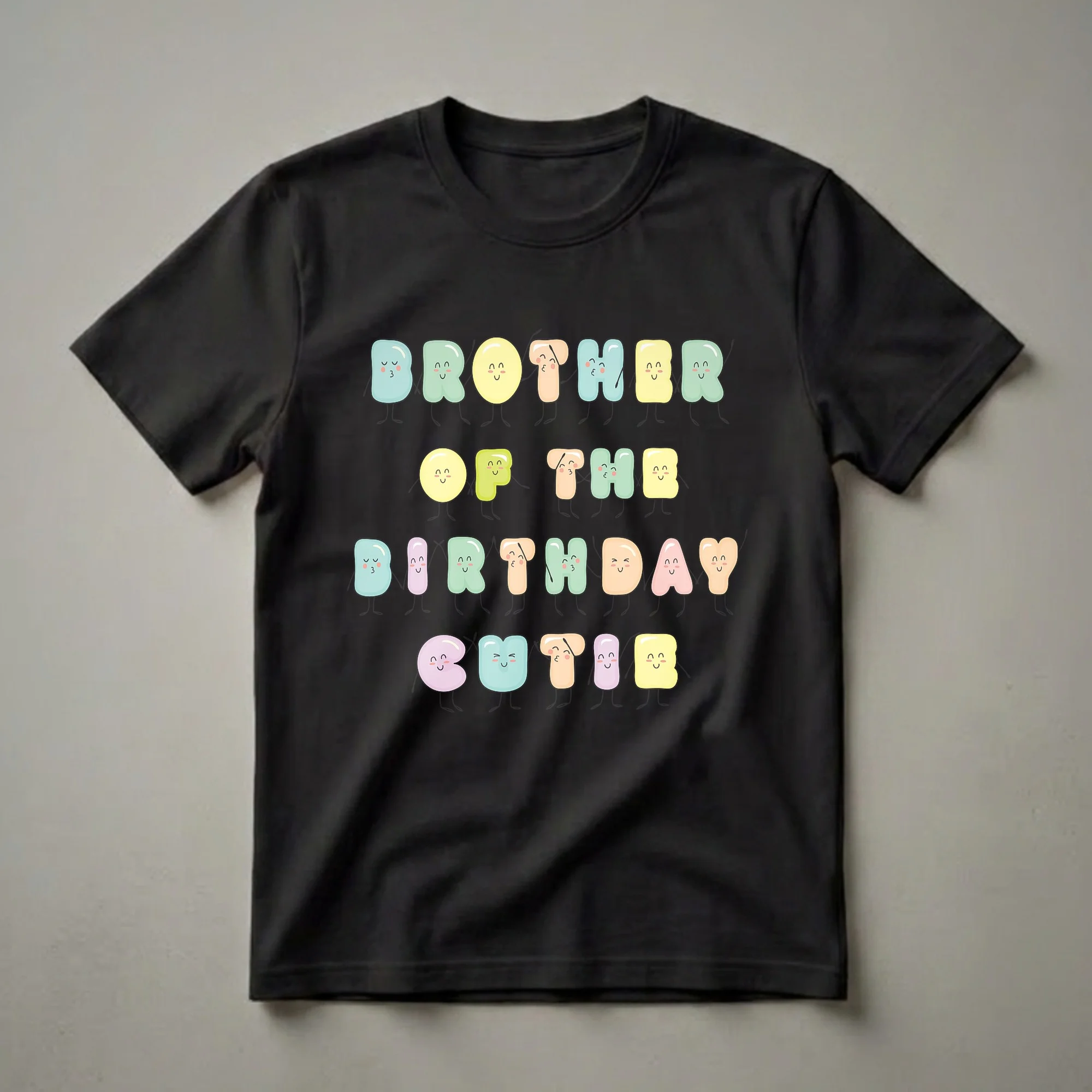 - This kawaii graphic tee proudly declares 'Brother of the Birthday Cutie' in colorful, playful lettering.