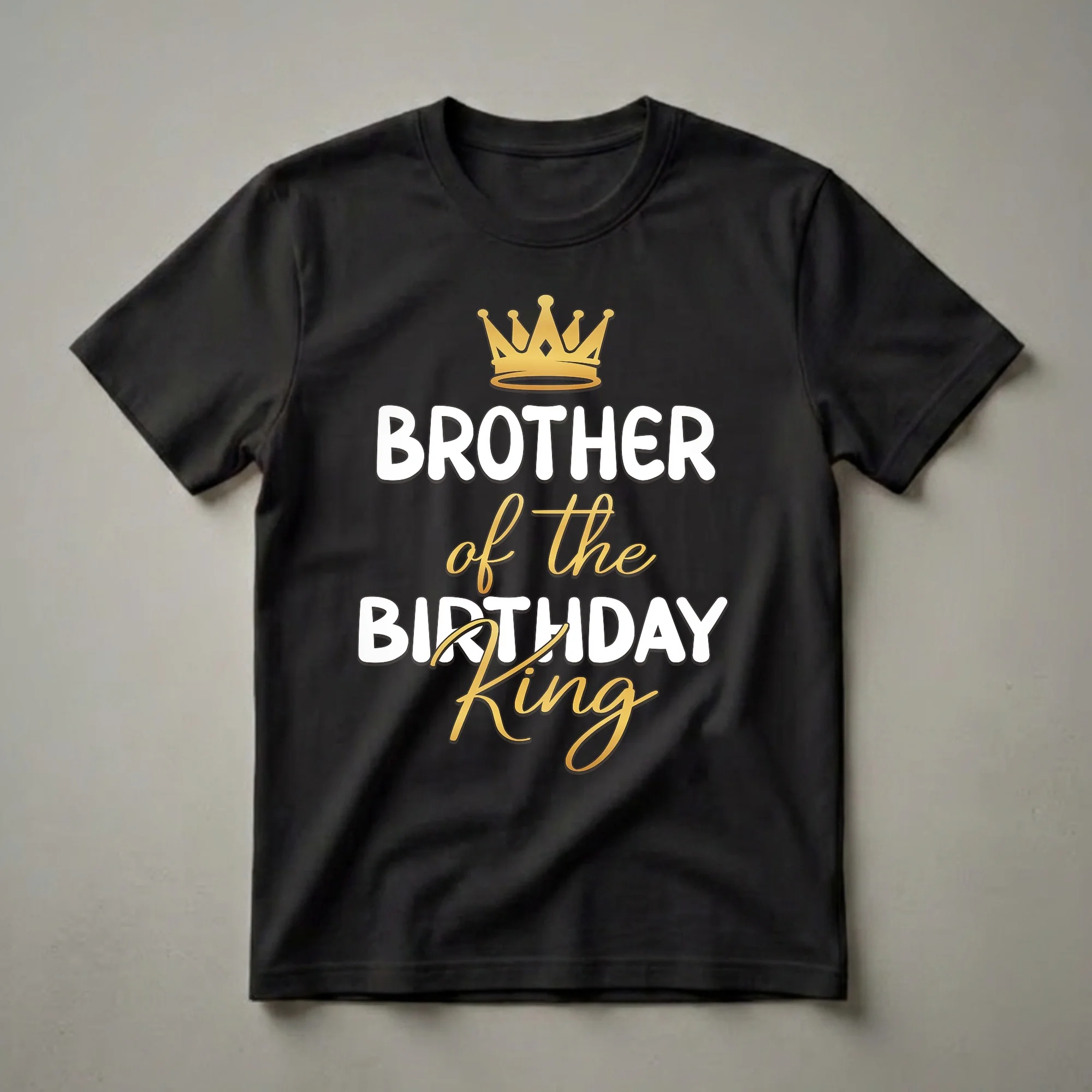 Brothers of birthday kings deserve to celebrate in style, and this graphic tee makes a statement. The design features a prominent golden crown positioned above bold white lettering that reads 'BROTHER'. Below this, in a stylish script font with a golden gradient, are the words 'of the BIRTHDAY King'. This shirt is a fantastic way for a brother to show his support and pride for the birthday boy, whether he's the younger sibling or an older brother. It's a staple piece for any birthday celebration, great to wear to the party, family gatherings, or even casual outings leading up to the big day. This t-shirt is a thoughtful gift idea for any brother who wants to join in the birthday festivities and highlight his special role. Imagine the birthday king and his brother, both sporting coordinating or complementary shirts, creating memorable photo opportunities. This apparel is a fun addition to any birthday wardrobe, ensuring the brother of the birthday star feels included and celebrated.