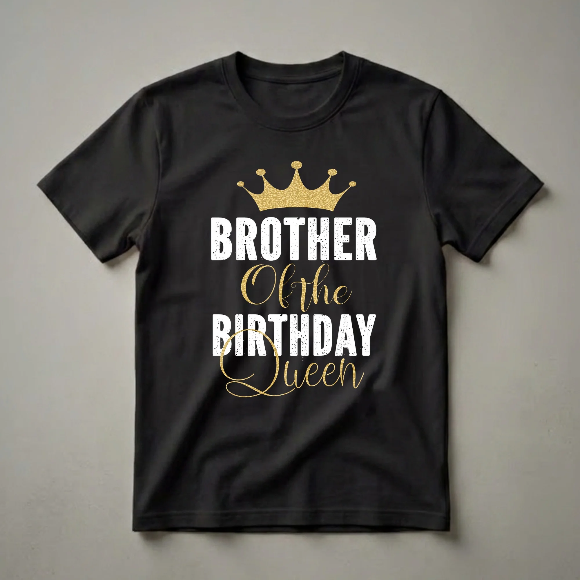 Brothers of birthday queens know their role is to support the star of the celebration. This graphic tee proudly declares that title with a striking gold crown and distressed lettering. The bold white text reads 'BROTHER' above a script font 'Of the' and then 'BIRTHDAY Queen' in distressed white and gold. This shirt is a thoughtful gift for any brother who wants to show his sister he's part of her special day. It's a staple for any birthday party, family gathering, or even just a casual outing where he wants to represent his sibling status. Imagine him wearing this to her birthday brunch or as she opens presents. This t-shirt is a fun way for him to join in the birthday festivities and celebrate his sister's milestone. It's a go-to tee for any brother looking to add a touch of celebratory spirit to his wardrobe. This apparel makes a thoughtful gift and a memorable keepsake from the birthday girl's special occasion. The design is eye-catching and clearly communicates his supportive role.