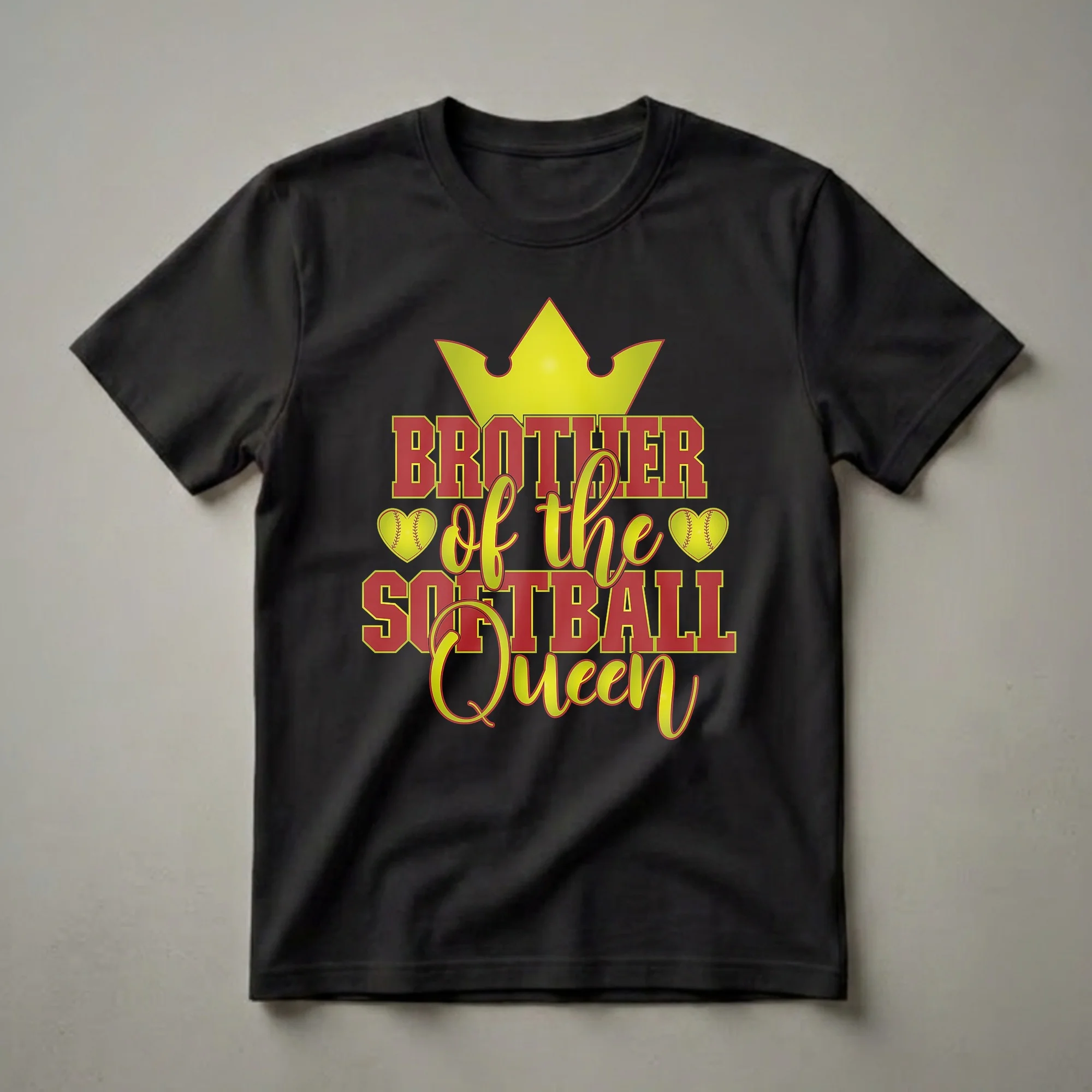 This striking graphic tee proudly declares 'Brother of the Softball Queen' in bold red and yellow lettering, crowned by a golden crown and flanked by two yellow softball hearts. The design is set against a black background, making the vibrant text and graphics pop. This shirt is a fantastic way for any young man to show his support for his sister who excels on the softball field. Softball is a sport that requires teamwork, speed, and precision, with players often specializing in positions like pitcher, catcher, or outfielder. This t-shirt is worn by the proud brother who attends games, cheers from the stands, and celebrates his sister's achievements. It makes a thoughtful gift for birthdays, holidays, or just to show appreciation for his supportive role in the family's softball journey. This comfortable tee is a go-to choice for casual wear, game days, or family gatherings, celebrating the bond between siblings and their shared passion for the sport. It's a staple for any brother whose sister is the star player.