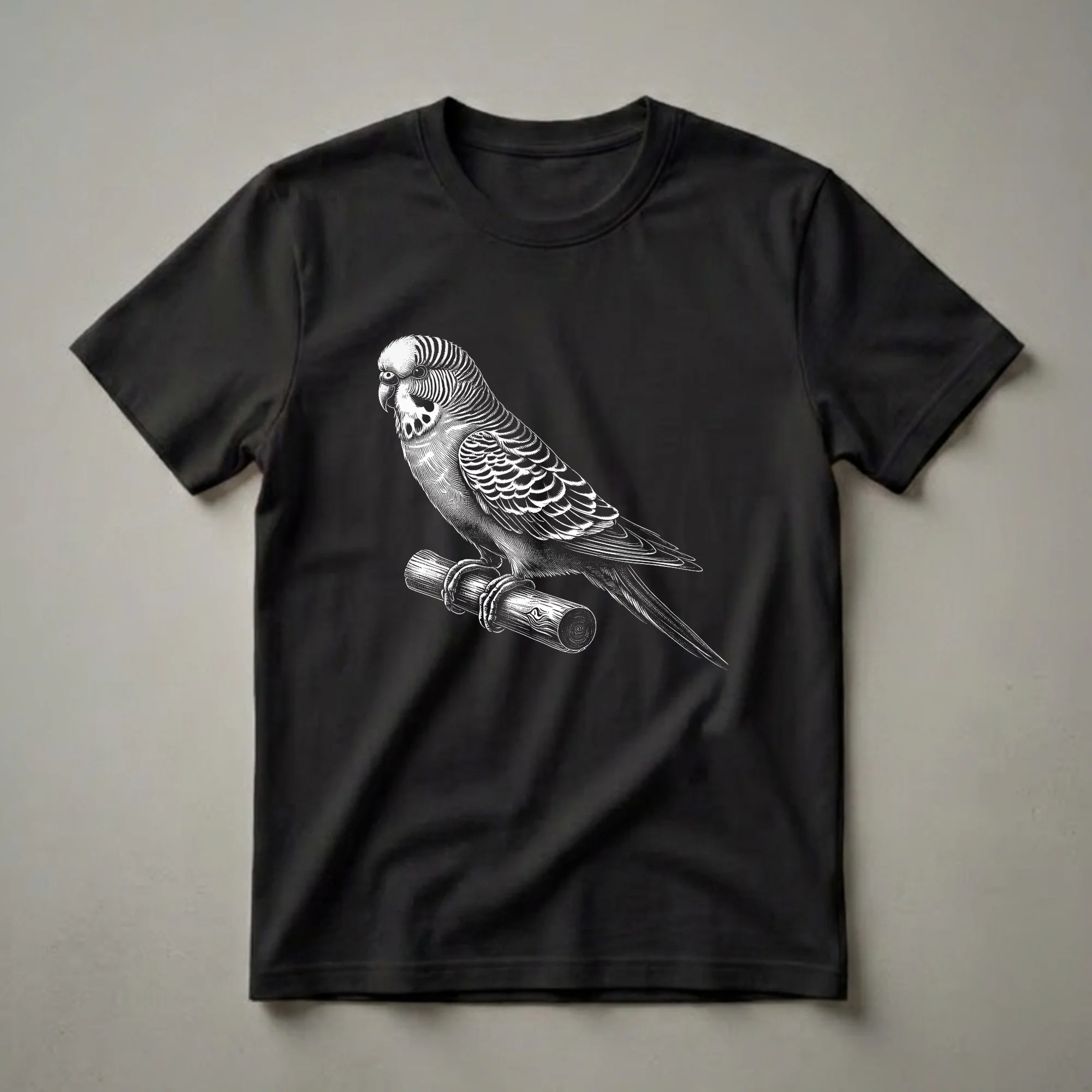 - A detailed engraving-style graphic tee for budgerigar enthusiasts.