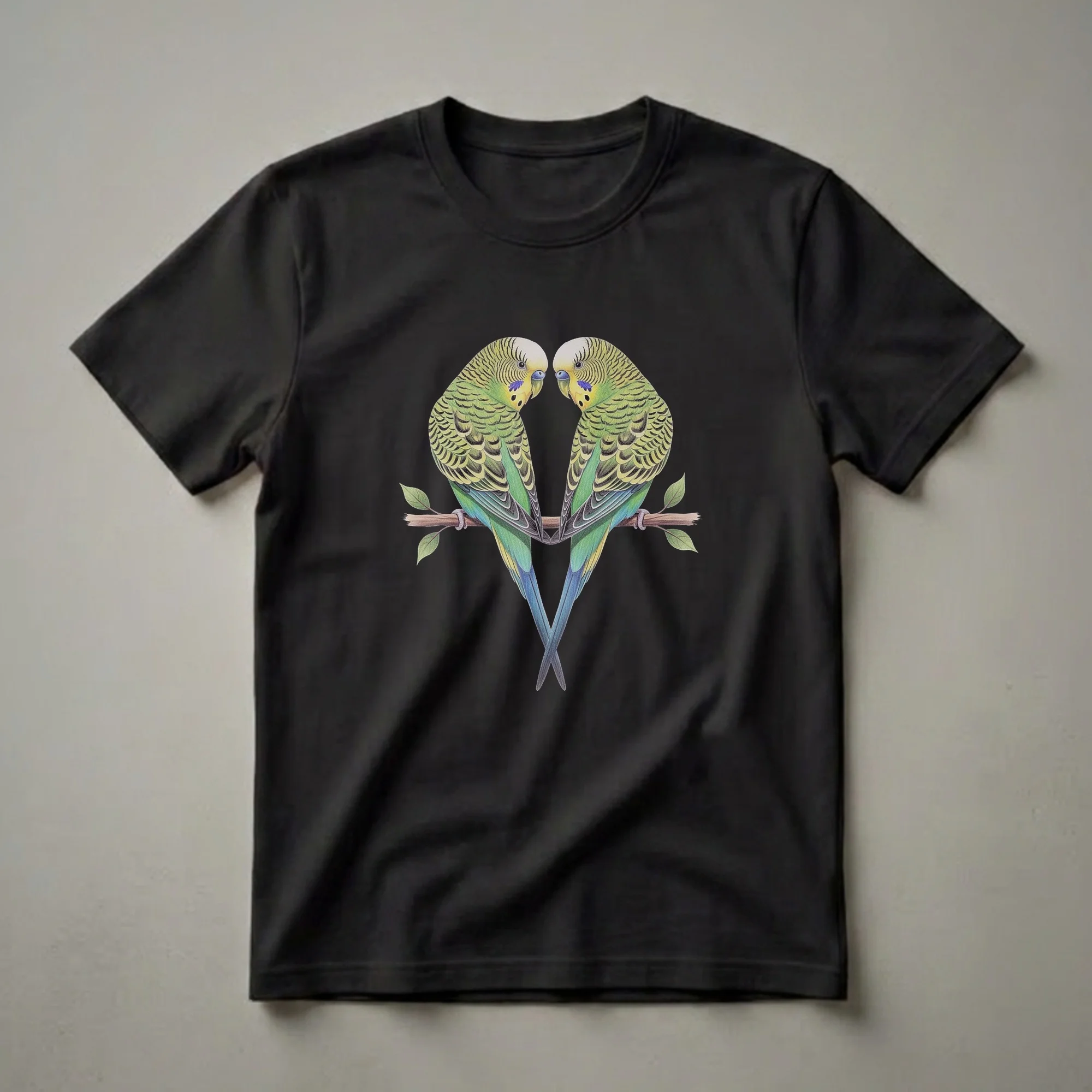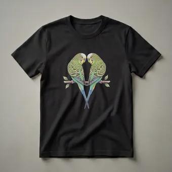 Budgerigars, often affectionately called budgies, are small, long-tailed, seed-eating parrots native to Australia. These charming birds are known for their vibrant green and yellow plumage, intricate feather patterns, and their ability to mimic sounds. This striking graphic tee features a beautifully rendered colored pencil illustration of two budgerigars perched on a branch, facing each other in a tender pose. The detailed artwork captures the delicate textures of their feathers, from the wavy patterns on their heads and wings to the vibrant blues and greens of their tails. The drawing style evokes a vintage natural history illustration, making this shirt a unique piece for any bird lover. This t-shirt is a wonderful way for bird moms and dads to express their affection for their feathered companions. It makes a thoughtful gift for anyone who appreciates the beauty of avian life or keeps parakeets as pets. Wear this tee to your next bird-watching outing or simply as a daily reminder of the joy these small creatures bring. The detailed rendering and the subject matter make this shirt a conversation starter among fellow bird enthusiasts.