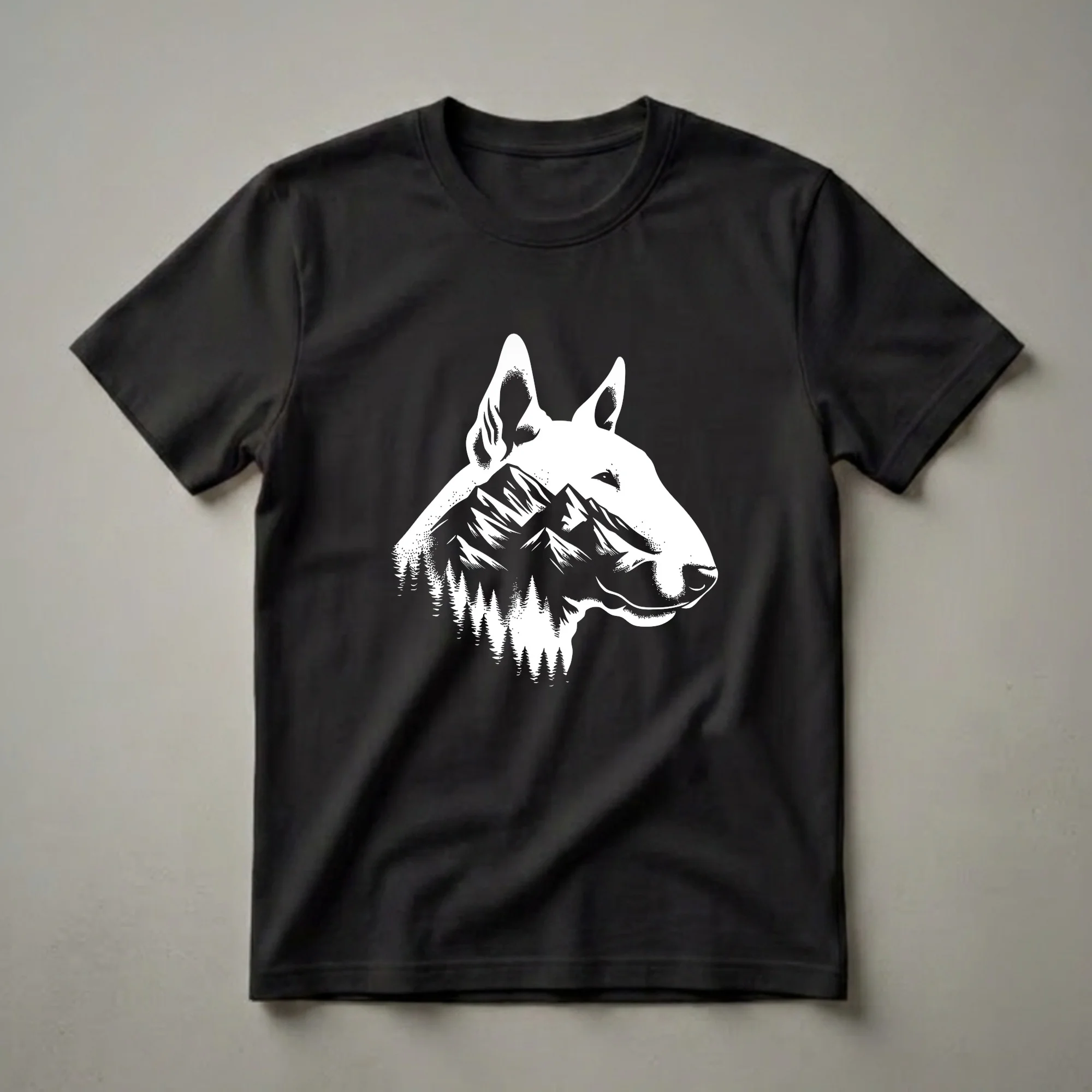 Bull Terrier owners who appreciate the rugged beauty of nature will reach for this distinctive graphic tee. The striking design features the iconic head of a Bull Terrier, rendered in a bold white silhouette against a black background. Within the dog's profile, a detailed landscape unfolds, showcasing a majestic mountain range piercing the sky, backed by a dense forest of pine trees. This artistic fusion captures the spirit of adventure and the deep bond between a dog and the great outdoors. Bull Terriers, known for their distinctive egg-shaped heads and spirited personalities, are often described as playful and courageous companions. This shirt is a thoughtful gift for any Bull Terrier mom or dad who enjoys hiking, camping, or simply cherishing the wild. Wear this eye-catching t-shirt on your next outdoor excursion or casual outing to spark conversations about your favorite breed and love for nature. It's a staple in the collection for any dog enthusiast.