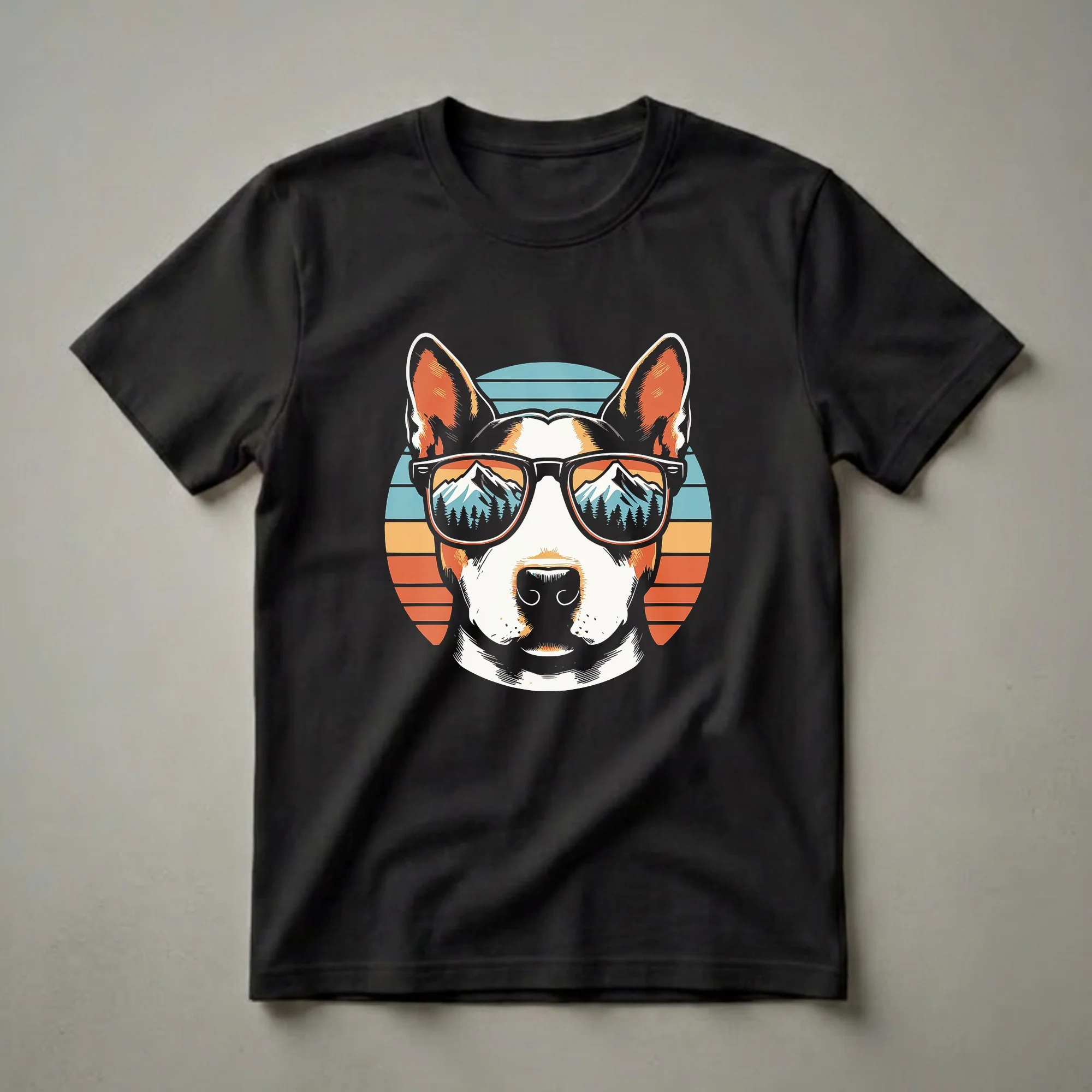 Bull Terrier owners who appreciate a blend of canine companionship and outdoor adventure will reach for this unique graphic tee. The design features a striking illustration of a Bull Terrier's face, complete with its distinctive features and alert ears. This eye-catching shirt showcases the dog wearing cool sunglasses, where a vibrant retro sunset scene unfolds, complete with snow-capped mountains and a dense forest of pine trees. The background is a classic retro circle with horizontal stripes in shades of orange, yellow, and blue, evoking a vintage sunset vibe. Bull Terriers, known for their playful and spirited personalities, are often seen as adventurous companions. This t-shirt is a thoughtful gift for any Bull Terrier mom or dad who loves hiking, camping, or simply enjoying the beauty of nature. Wear this tee on your next outdoor excursion or casual outing to express your passion for your furry friend and the wilderness. It's a staple in the collection for any dog lover with an adventurous spirit.