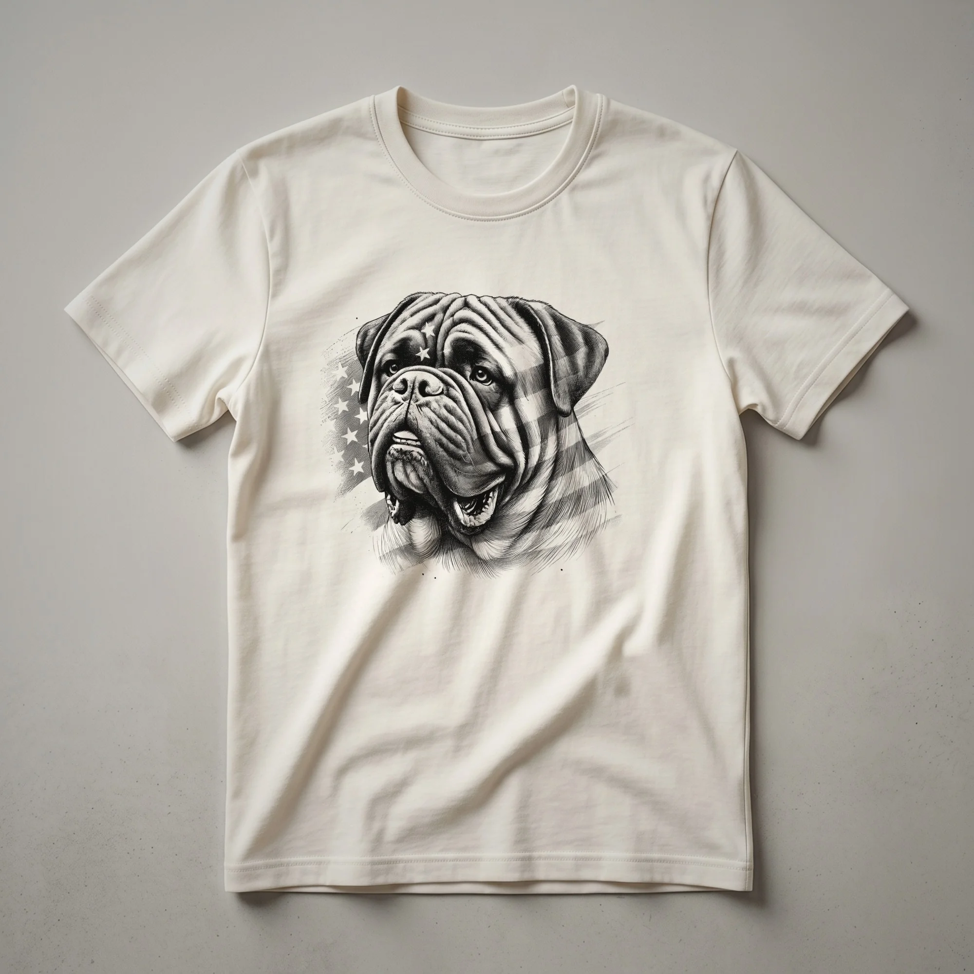 - Features a cool Bullmastiff wearing sunglasses with an American flag design.