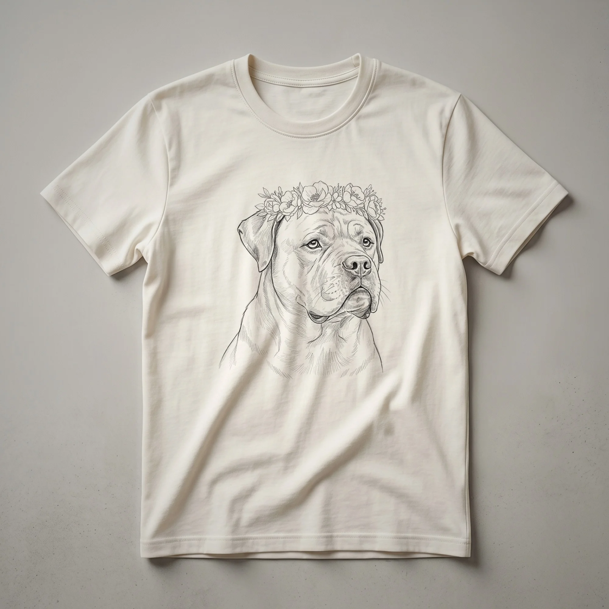 Bullmastiff moms and dads who want to wear their affection on their sleeve will reach for this eye-catching graphic tee. The design features a striking illustration of a Bullmastiff's head, rendered with a gentle expression, encircled by a vibrant floral wreath. This artistic combination blends the powerful presence of the Bullmastiff breed with the delicate beauty of blooming flowers, creating a unique statement piece. Bullmastiffs, known for their loyalty and protective nature, originated in England in the late 19th century as a cross between the Bulldog and the Mastiff, bred to guard estates. This t-shirt serves as a wonderful way to celebrate the bond with these impressive dogs. It makes a thoughtful gift for any Bullmastiff owner, whether it's for a birthday, holiday, or just because. Wear this comfortable shirt to casual outings, dog park visits, or while relaxing at home, letting everyone know about your favorite breed. This shirt is a staple for any dog lover's wardrobe.