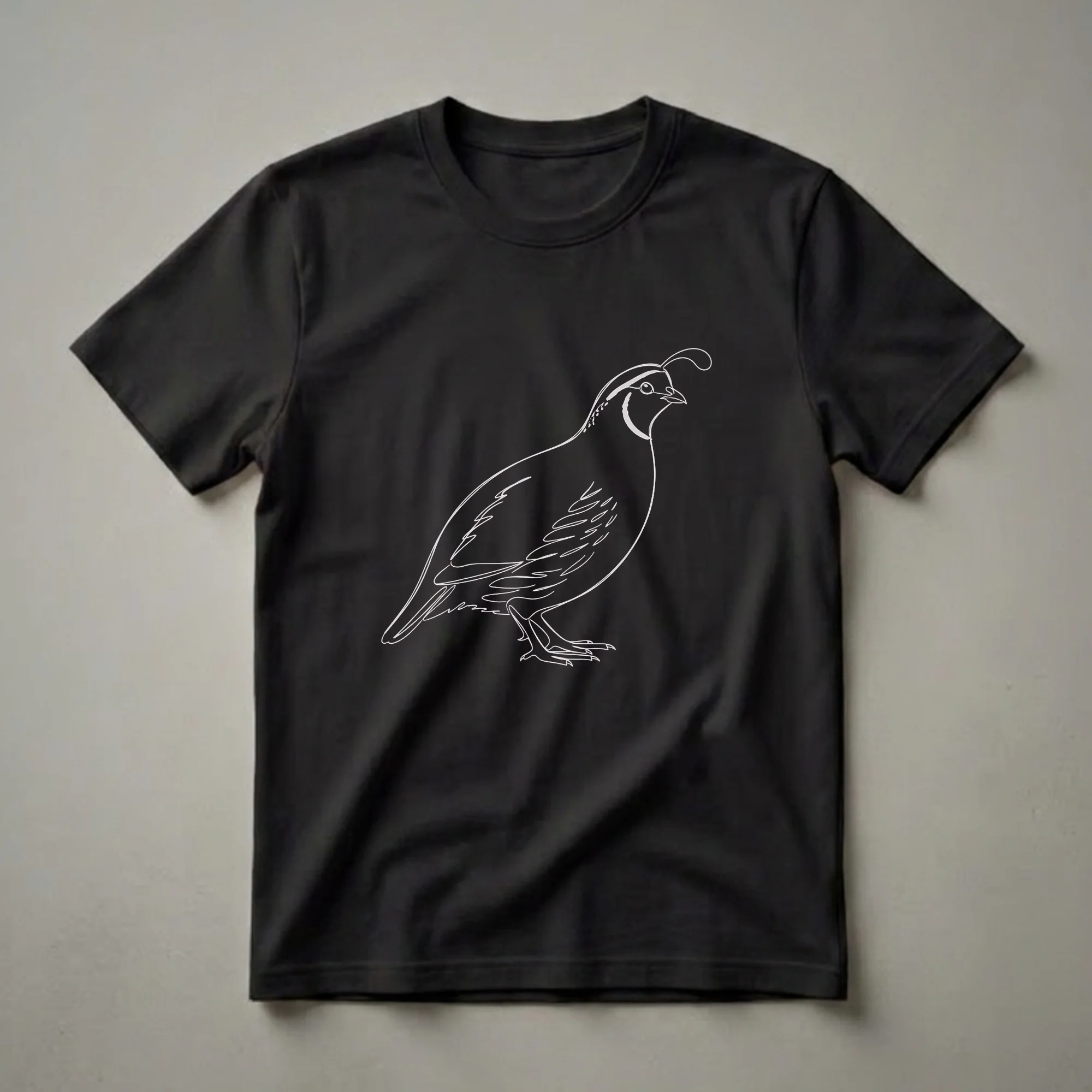 Birdwatchers and lovers of clean, minimal wildlife illustration will reach for this California quail line art tee. The design depicts a quail in three-quarter profile, its most recognizable feature, the forward-curving black topknot plume, rendered in confident white line art that stands out crisply against the black shirt. The compact rounded body, short bill, and subtly detailed wing texture give the drawing enough information to be a faithful portrait without overworking the lines. The California quail (Callipepla californica) is the state bird of California, designated in 1931. It is found in chaparral, oak woodland edges, scrublands, and suburban gardens throughout the western United States, from Baja California north through Oregon and Washington. California quail are highly social birds that live in coveys, groups of 10 to 200 individuals, and communicate through a distinctive three-note call often transcribed as "Chi-ca-go." Males stand guard on elevated perches while the covey forages on the ground below. This shirt makes a thoughtful gift for California residents, western birdwatchers, hikers, or any birder who has a soft spot for this charismatic little game bird. Wear this tee on a nature walk, a birdwatching trip to the Sierras or the Central Valley, or any casual outing to carry your affection for western American wildlife. The clean line art style makes this design timeless and versatile.