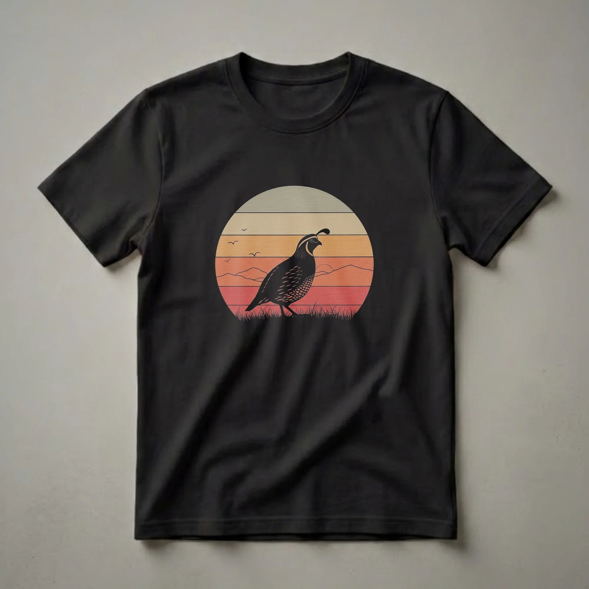 - Retro California Quail t-shirt with a vintage sunset design.