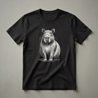 Capybaras, the world's largest rodents, are known for their calm and social nature, often seen relaxing in groups near bodies of water. This striking graphic tee features a detailed line art illustration of a capybara, rendered in a classic woodcut style against a solid black background. The intricate linework captures the animal's distinctive features, from its blunt snout and small ears to its sturdy, fur-covered body and webbed feet. Native to South America, capybaras inhabit savannas and dense forests, always near lakes, rivers, or swamps. This shirt is a fantastic way for men and women who appreciate unique wildlife art to express their admiration for these gentle giants. It makes a thoughtful gift for hikers, nature photographers, or anyone who finds joy in observing animals in their natural habitat. Wear this capybara shirt to your next nature walk or casual outing to spark conversations about these fascinating creatures. This apparel is a staple in the collection.